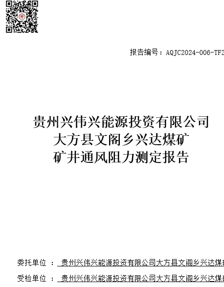 大方縣文閣鄉(xiāng)興達(dá)煤礦礦井通風(fēng)阻力測(cè)定報(bào)告
