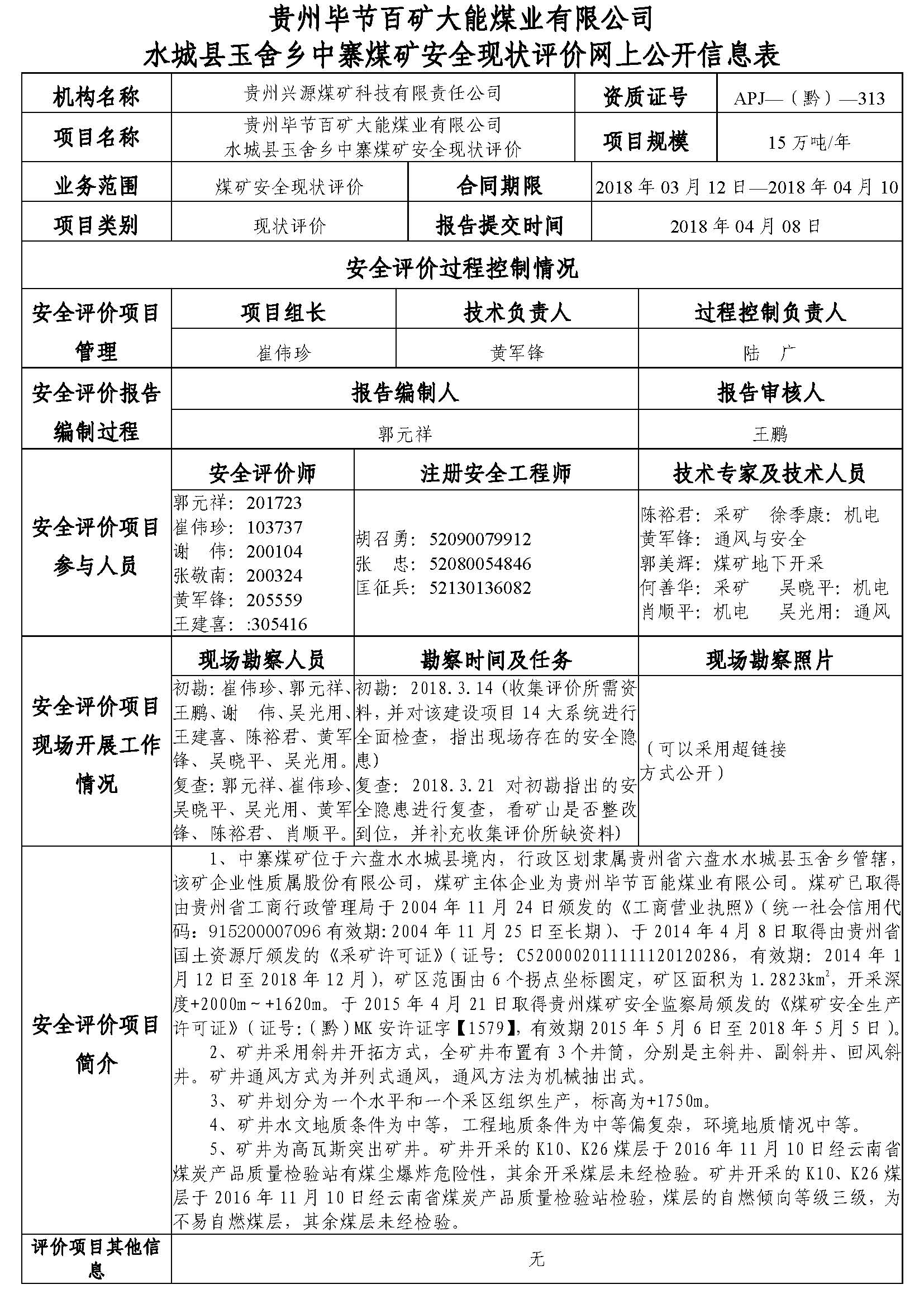 貴州畢節(jié)百礦大能煤業(yè)有限公司水城縣玉舍鄉(xiāng)中寨煤礦安全現(xiàn)狀評(píng)價(jià)網(wǎng)上公開(kāi)信息表