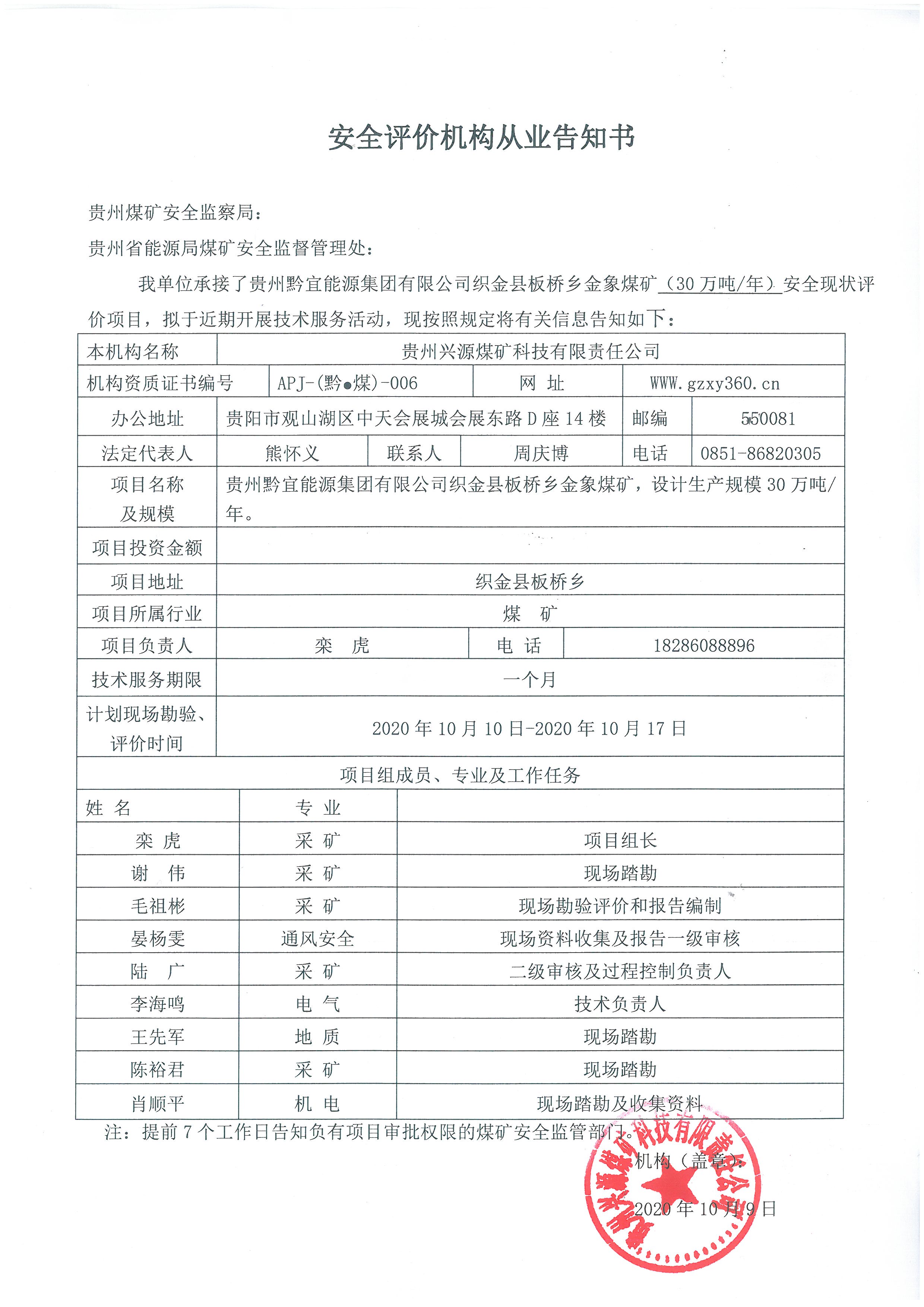 安全評價機(jī)構(gòu)從業(yè)告知書(貴州黔宜能源集團(tuán)有限公司織金縣板橋鄉(xiāng)金象煤礦)