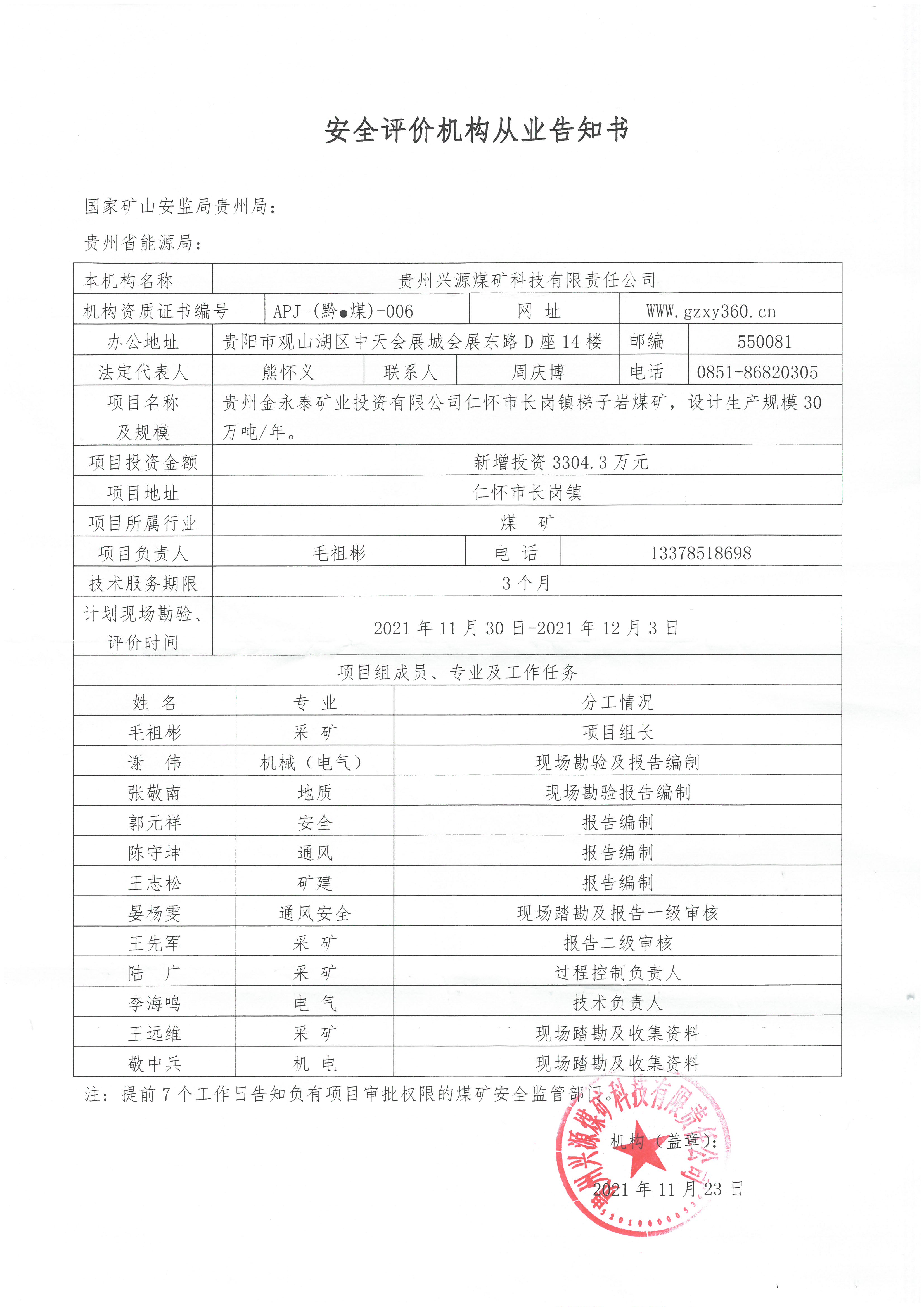 安全評價機構從業(yè)告知書(貴州金永泰礦業(yè)投資有限公司仁懷市長崗鎮(zhèn)梯子巖煤礦)