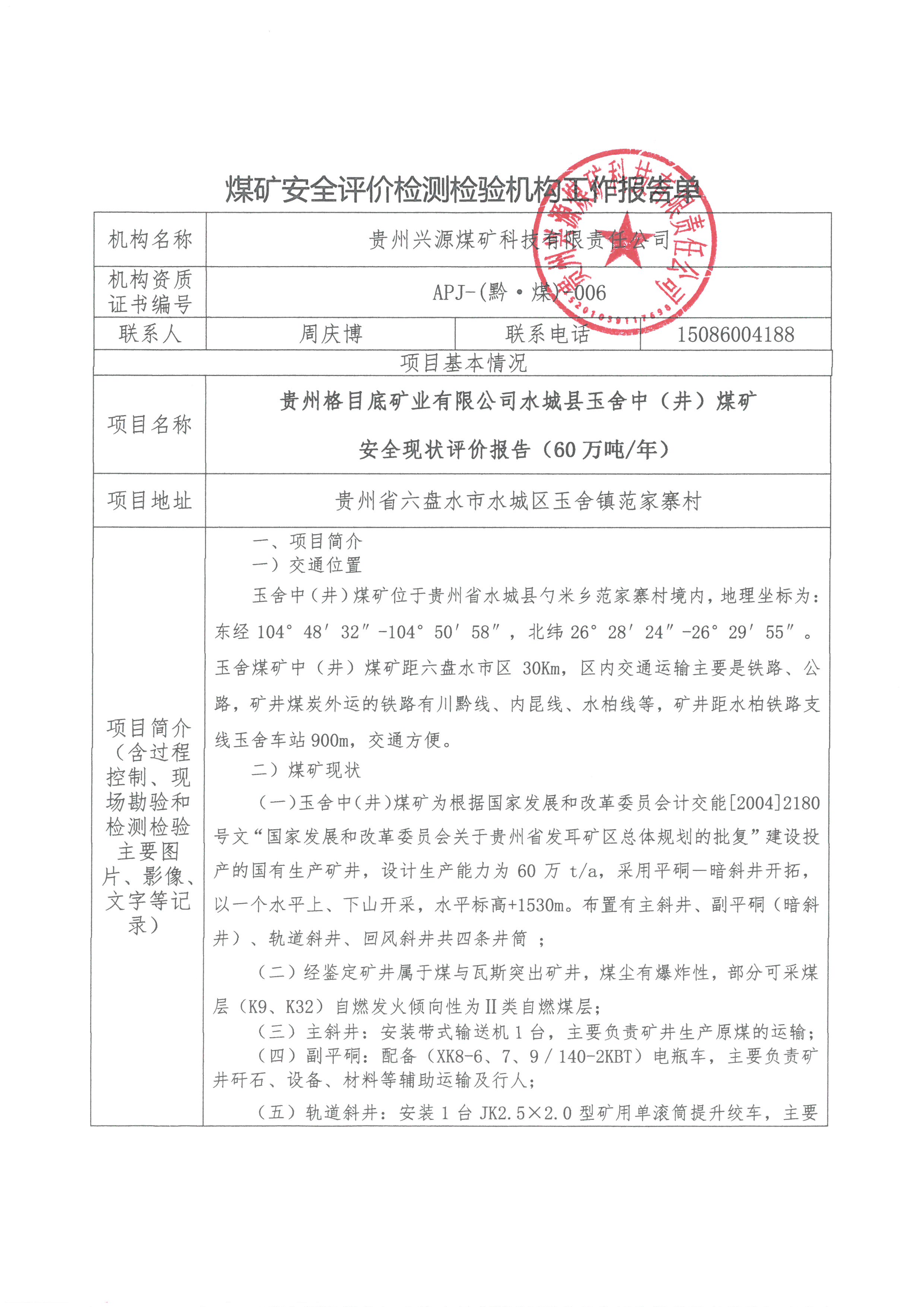 煤礦安全評價檢測檢驗機構(gòu)工作報告單【貴州格目底礦業(yè)有限公司水城縣玉舍中(井)煤礦 安全現(xiàn)狀評價報告(60萬噸/年)】