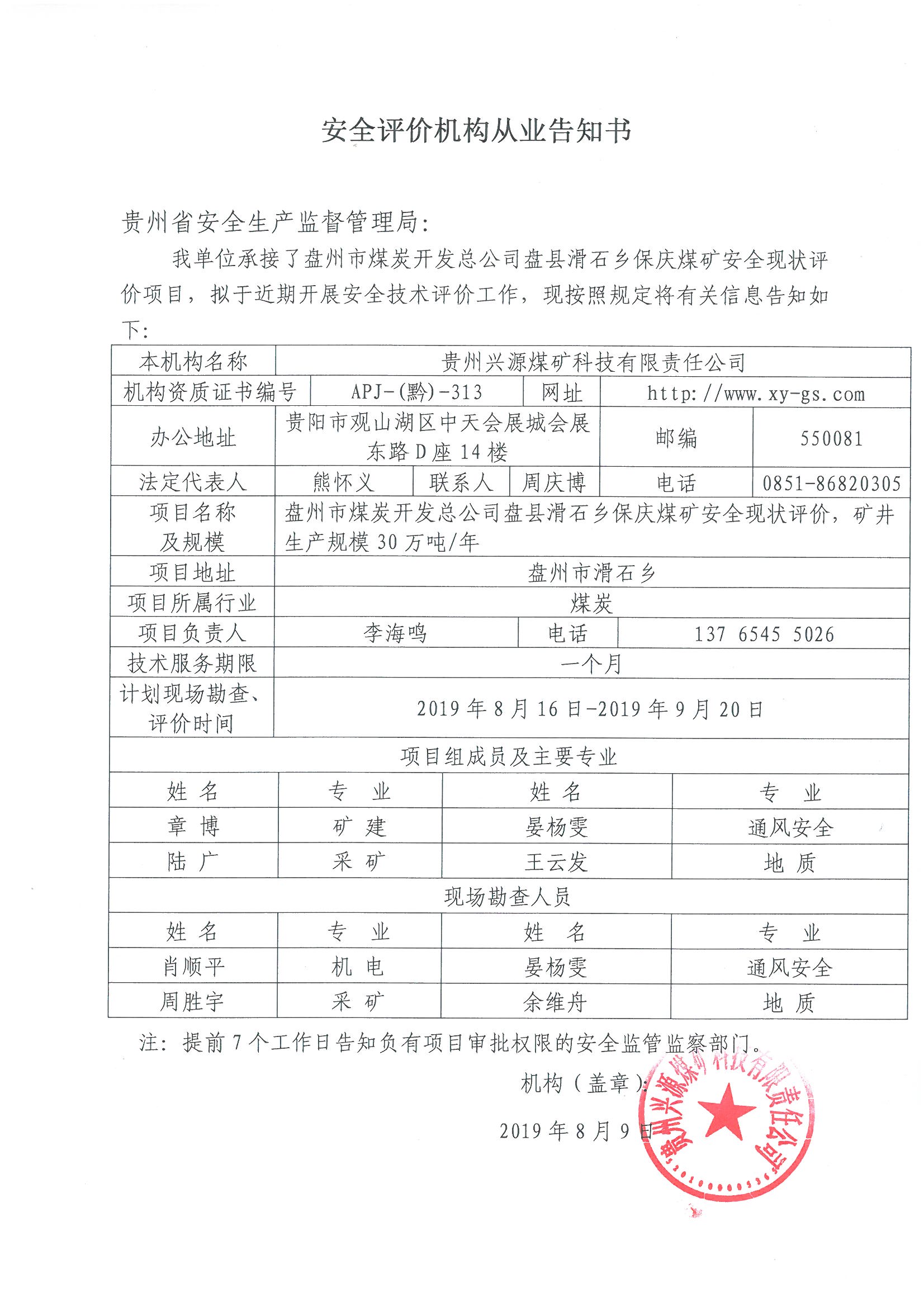 安全評價機構從業(yè)告知書[盤州市煤炭開發(fā)總公司盤縣滑石鄉(xiāng)保慶煤礦]