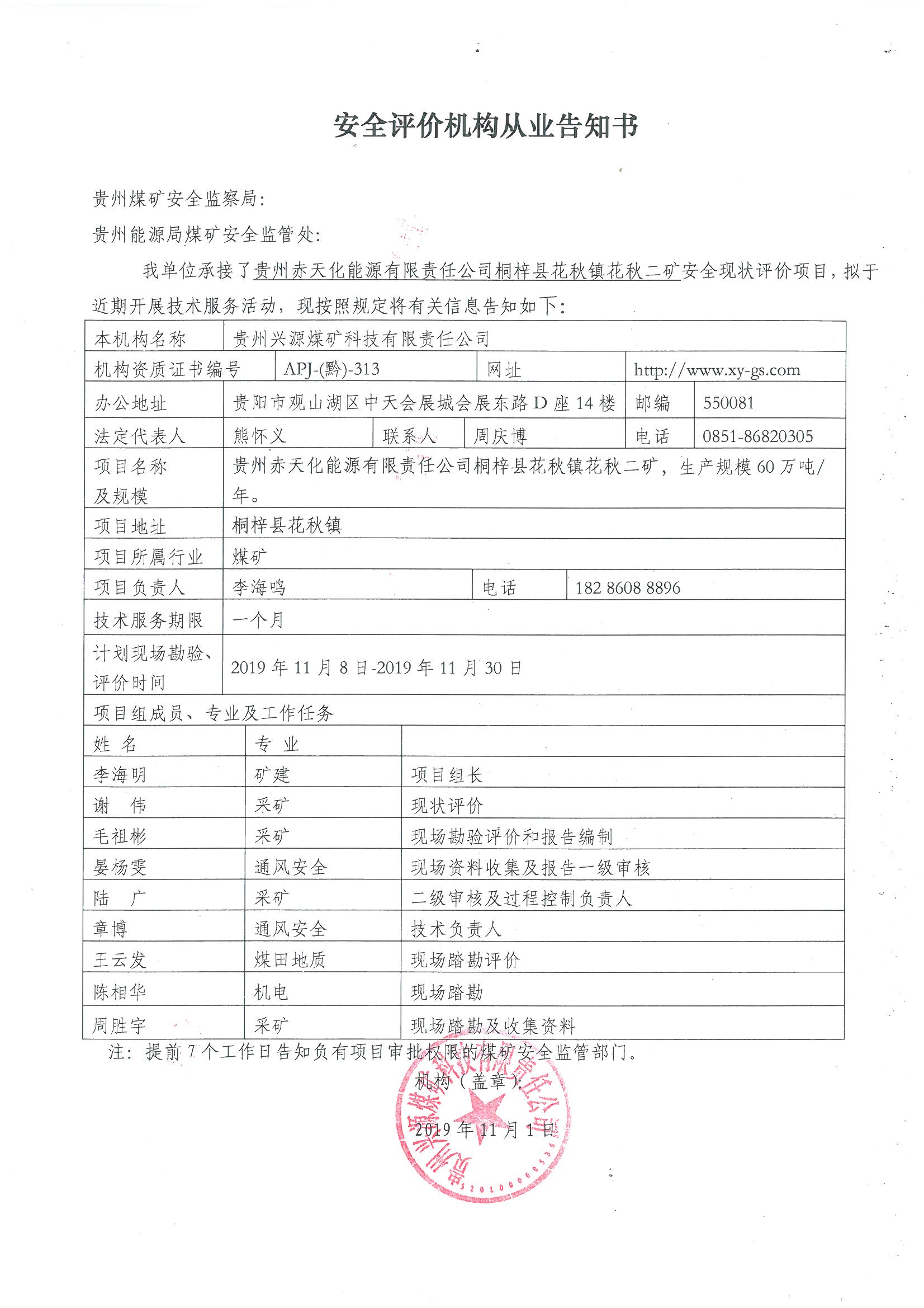 安全評(píng)價(jià)機(jī)構(gòu)從業(yè)告知書[貴州赤天化能源有限責(zé)任公司桐梓縣花秋鎮(zhèn)花秋二礦]