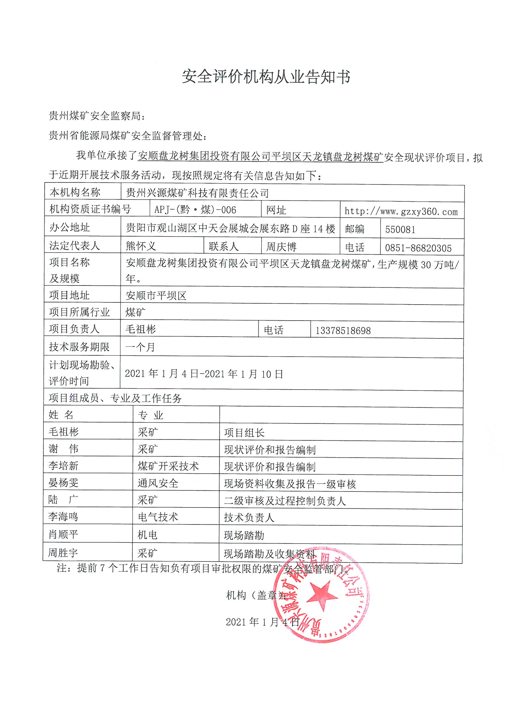 安全評價(jià)機(jī)構(gòu)從業(yè)告知書(安順盤龍樹集團(tuán)投資有限公司平壩區(qū)天龍鎮(zhèn)盤龍樹煤礦)