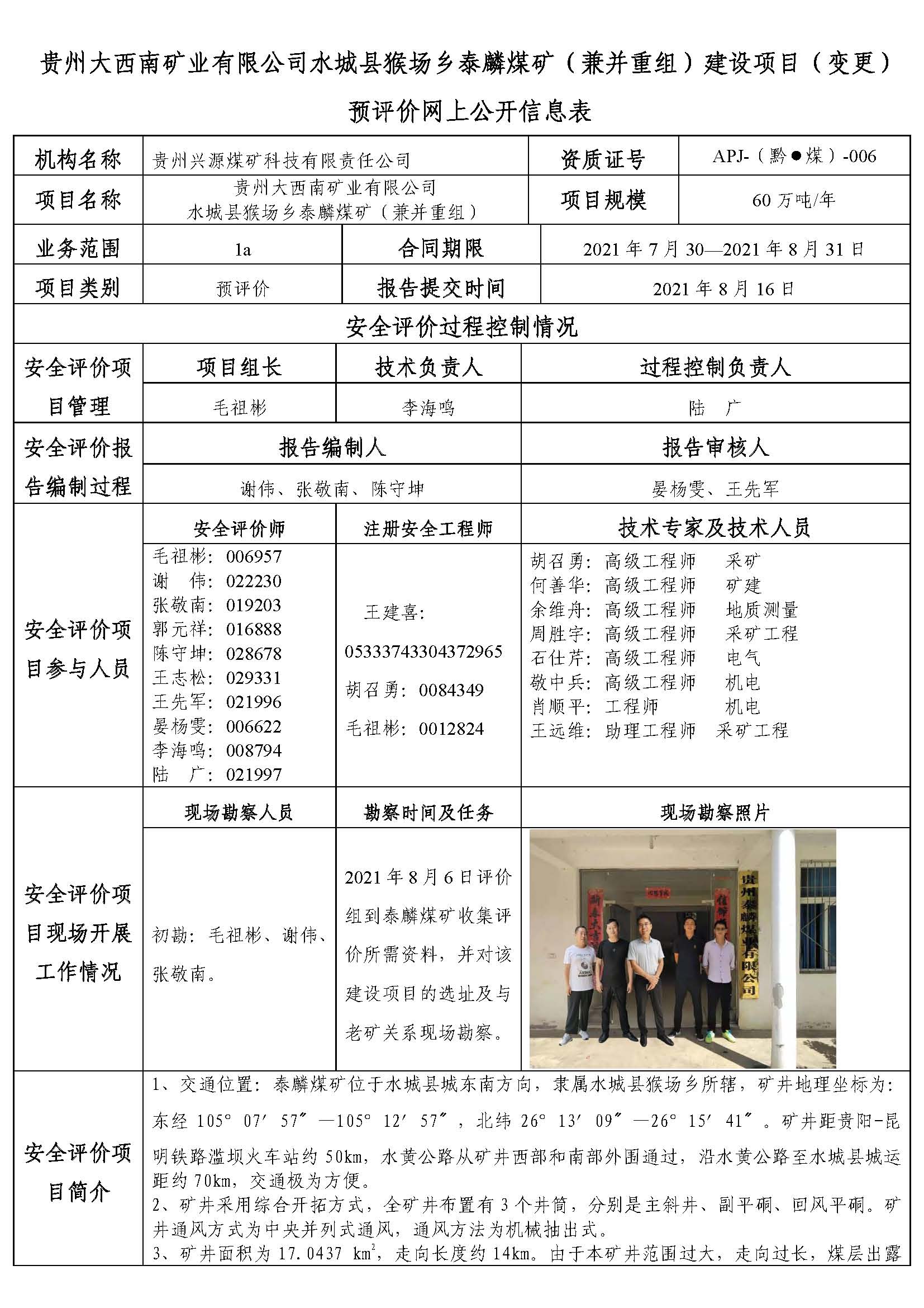 貴州大西南礦業(yè)有限公司水城縣猴場鄉(xiāng)泰麟煤礦(兼并重組)建設(shè)項(xiàng)目(變更)預(yù)評價(jià)網(wǎng)上公開信息表