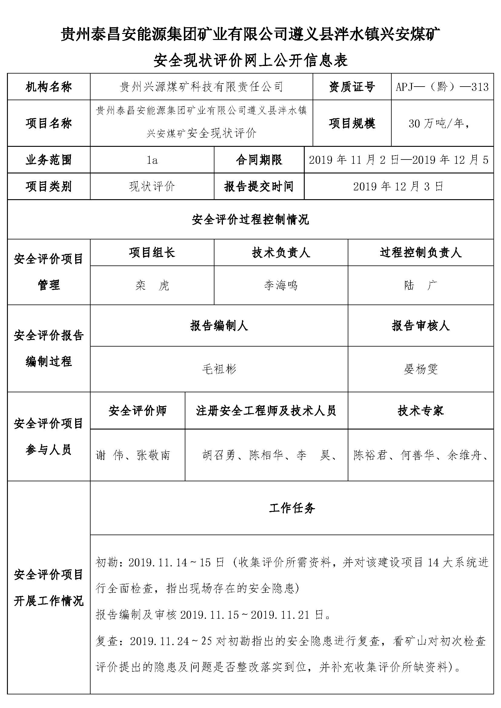 貴州泰昌安能源集團(tuán)礦業(yè)有限公司遵義縣泮水鎮(zhèn)興安煤礦安全現(xiàn)狀評價(jià)網(wǎng)上公開信息表