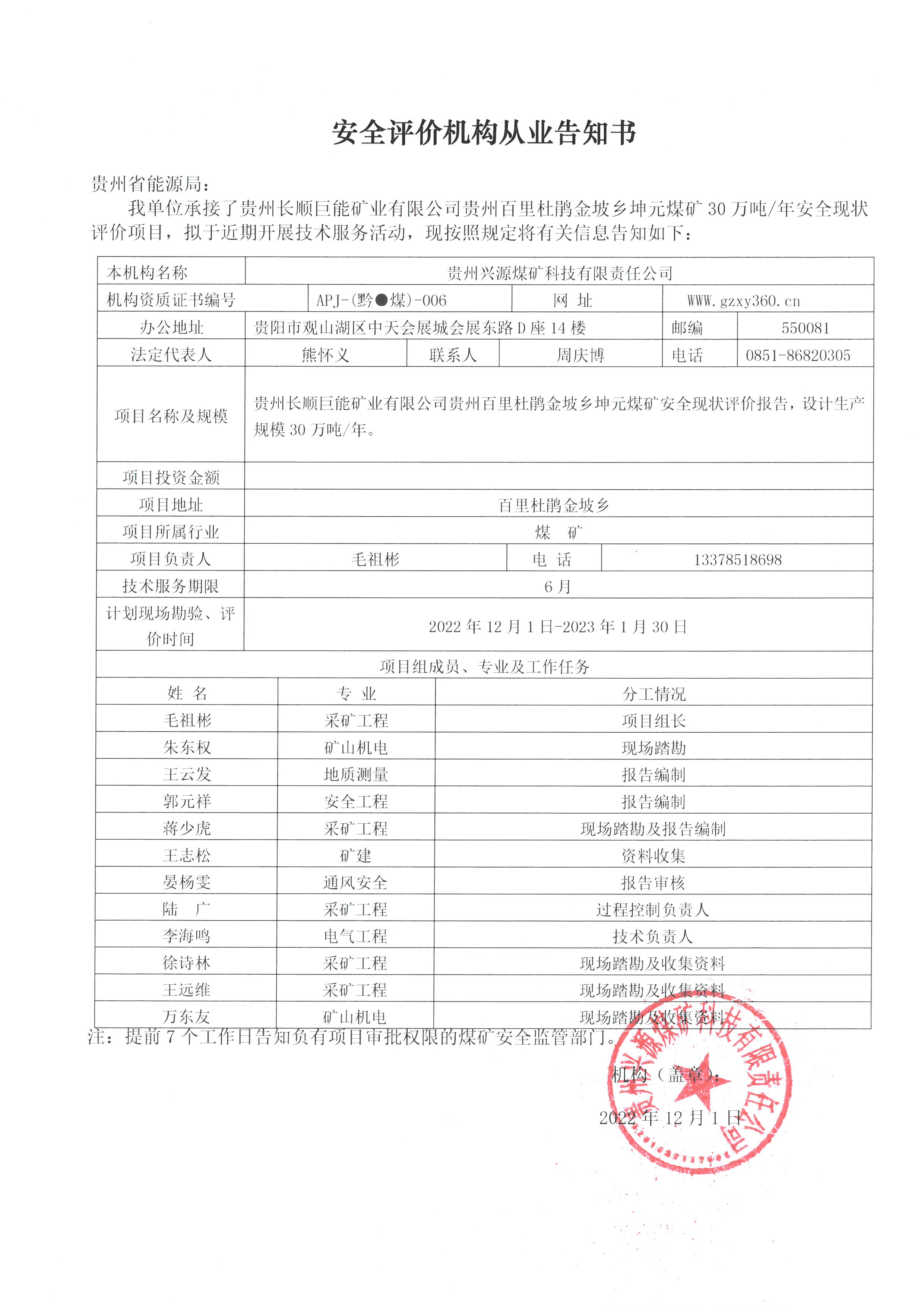 安全評價機(jī)構(gòu)從業(yè)告知書【貴州長順巨能礦業(yè)有限公司貴州百里杜鵑金坡鄉(xiāng)坤元煤礦】