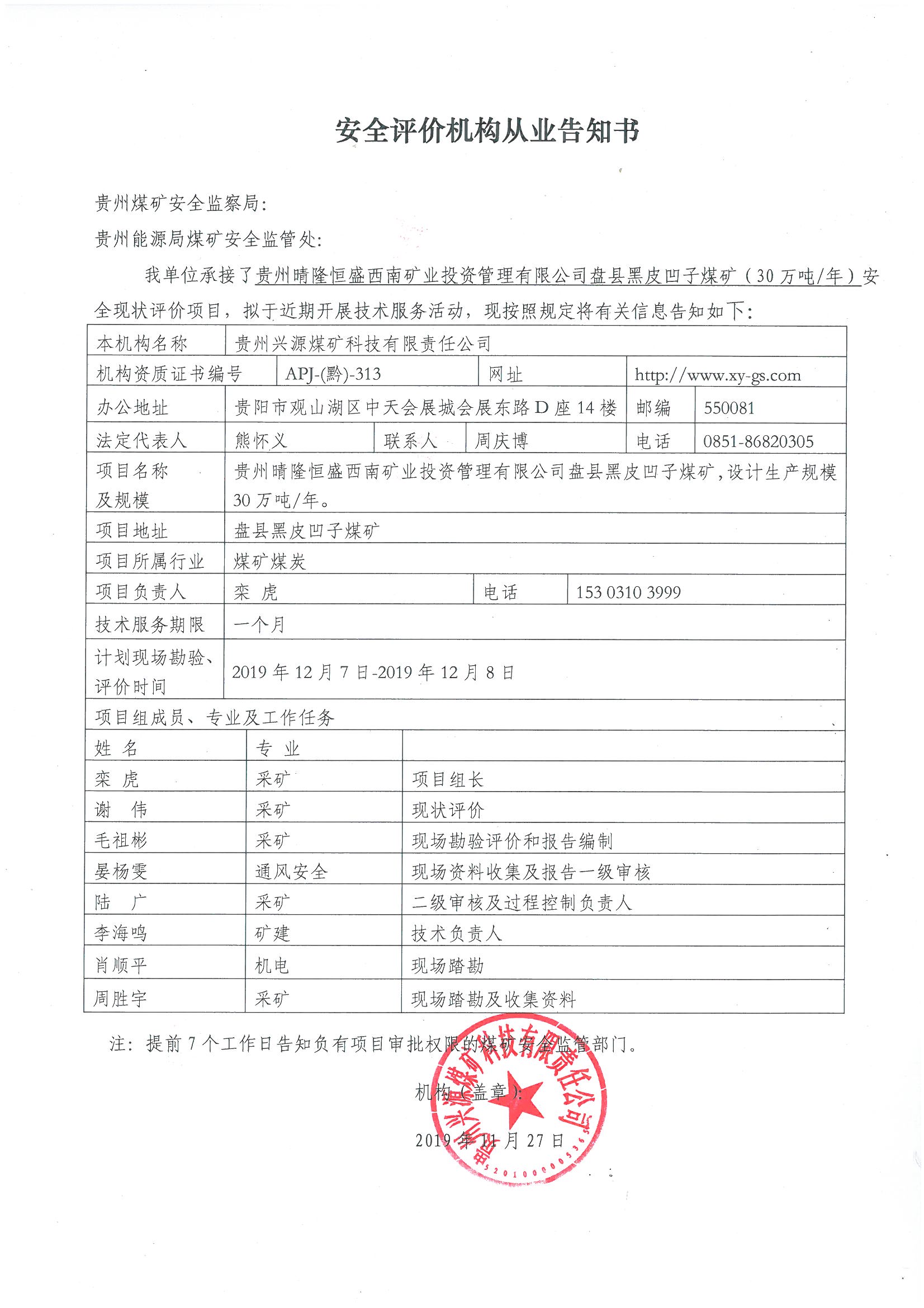 安全評價機(jī)構(gòu)從業(yè)告知書[貴州晴隆恒盛西南礦業(yè)投資管理有限公司盤縣黑皮凹子煤礦(30萬噸/年)安全現(xiàn)狀評價]