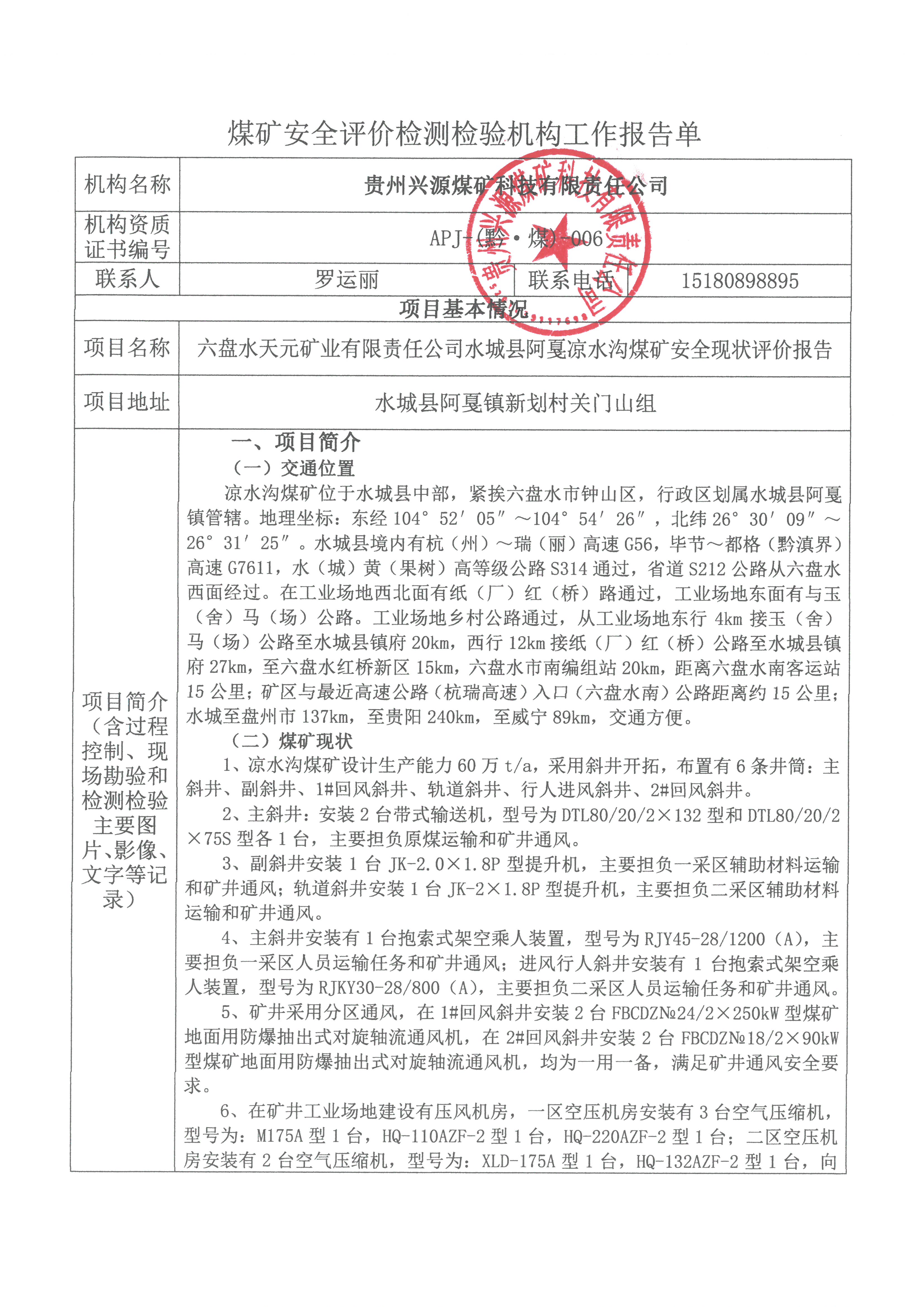 煤礦安全評價(jià)檢測檢驗(yàn)機(jī)構(gòu)工作報(bào)告單【六盤水天元礦業(yè)有限責(zé)任公司水城縣阿戛涼水溝煤礦安全現(xiàn)狀評價(jià)報(bào)告】