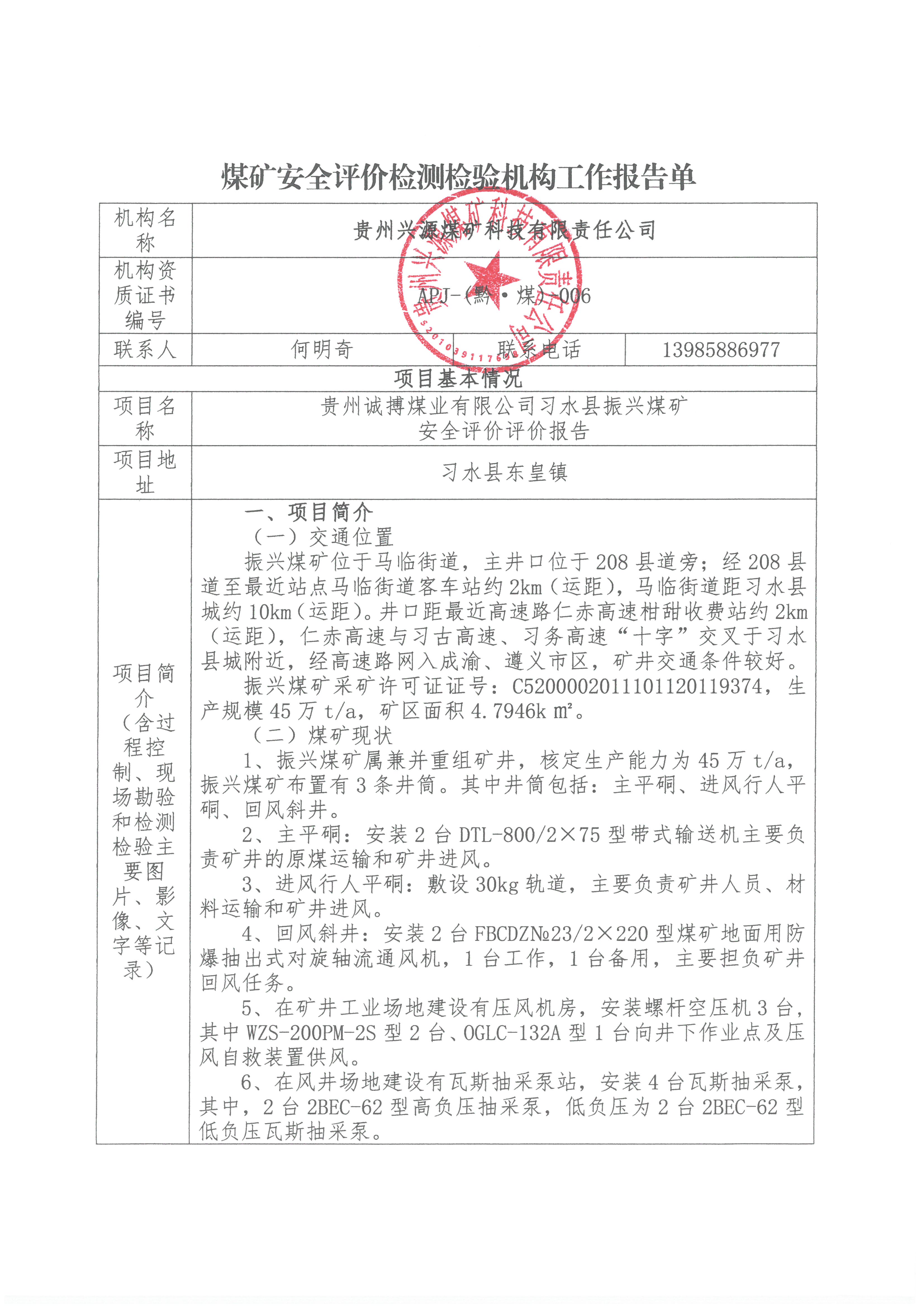 煤礦安全評(píng)價(jià)檢測(cè)檢驗(yàn)機(jī)構(gòu)工作報(bào)告單【貴州誠(chéng)搏煤業(yè)有限公司習(xí)水縣振興煤礦安全評(píng)價(jià)評(píng)價(jià)報(bào)告】