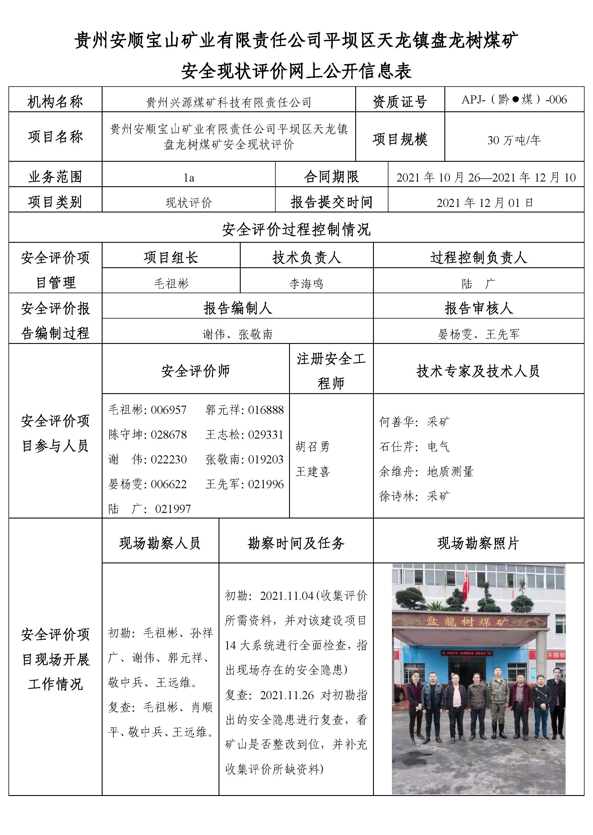 貴州安順寶山礦業(yè)有限責(zé)任公司平壩區(qū)天龍鎮(zhèn)盤龍樹煤礦安全現(xiàn)狀評(píng)價(jià)網(wǎng)上公開信息表