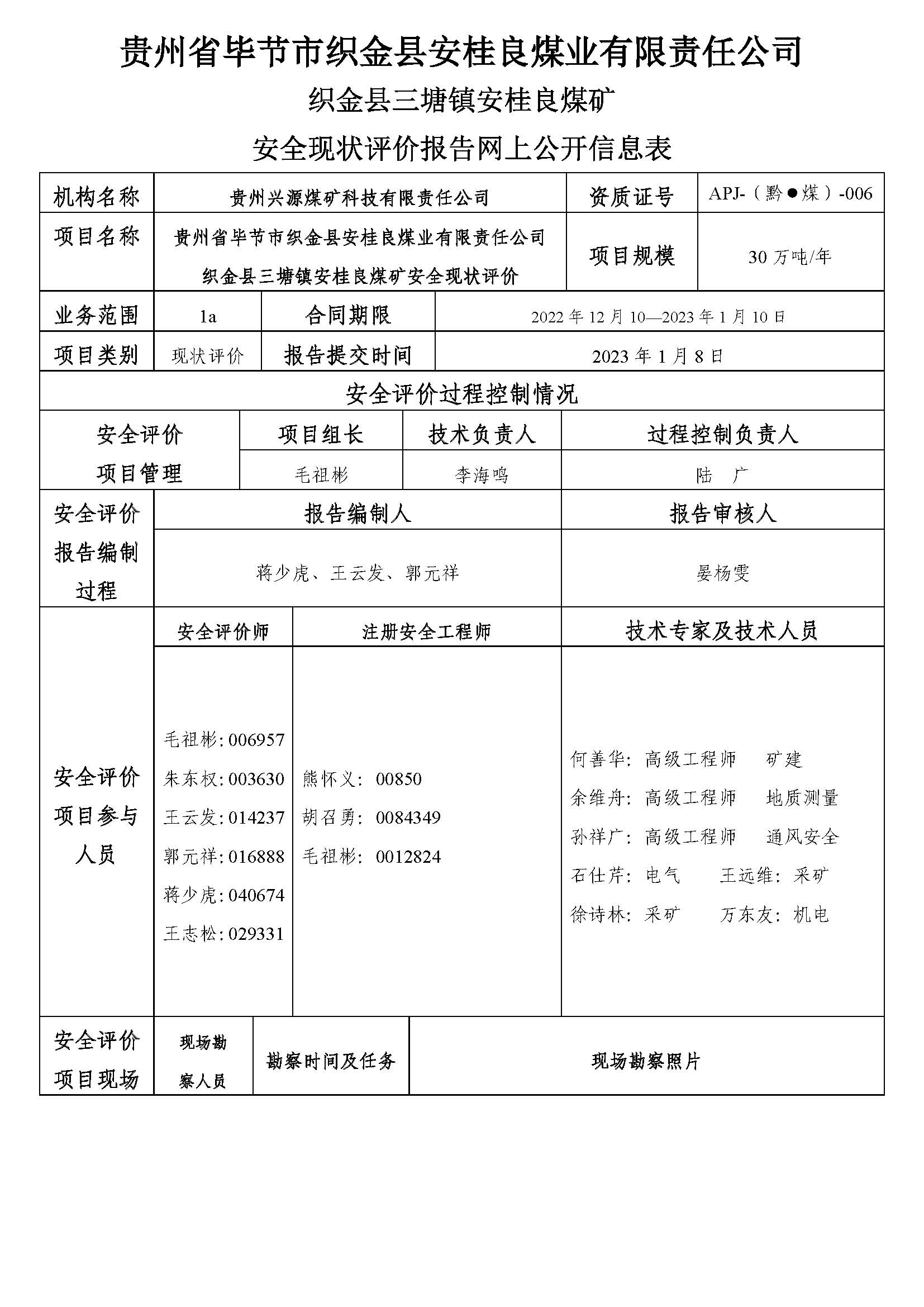 貴州省畢節(jié)市織金縣安桂良煤業(yè)有限責(zé)任公司織金縣三塘鎮(zhèn)安桂良煤礦安全現(xiàn)狀評價報告網(wǎng)上公開信息表