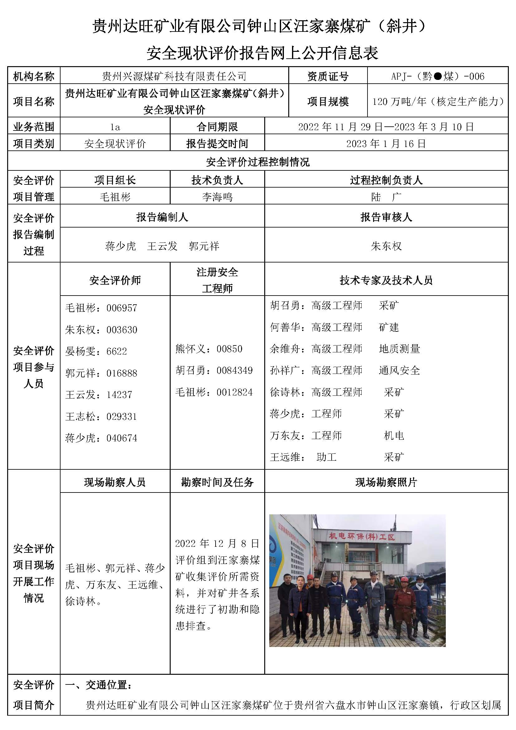 貴州達(dá)旺礦業(yè)有限公司鐘山區(qū)汪家寨煤礦(斜井)安全現(xiàn)狀評價(jià)報(bào)告網(wǎng)上公開信息表