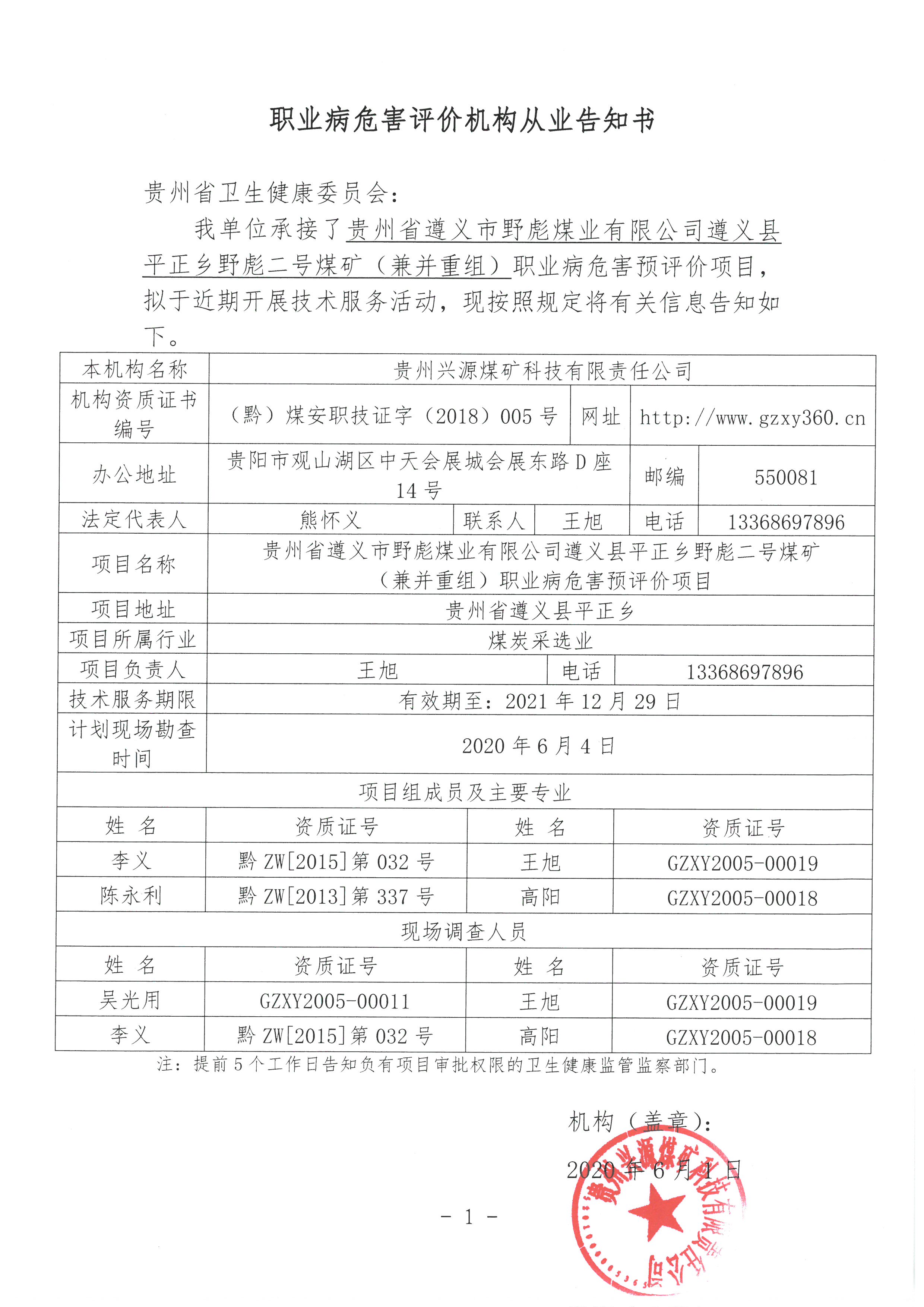 職業(yè)病危害評價機(jī)構(gòu)從業(yè)告知書【貴州省遵義市野彪煤業(yè)有限公司遵義縣平正鄉(xiāng)野彪二號煤礦(兼并重組)】