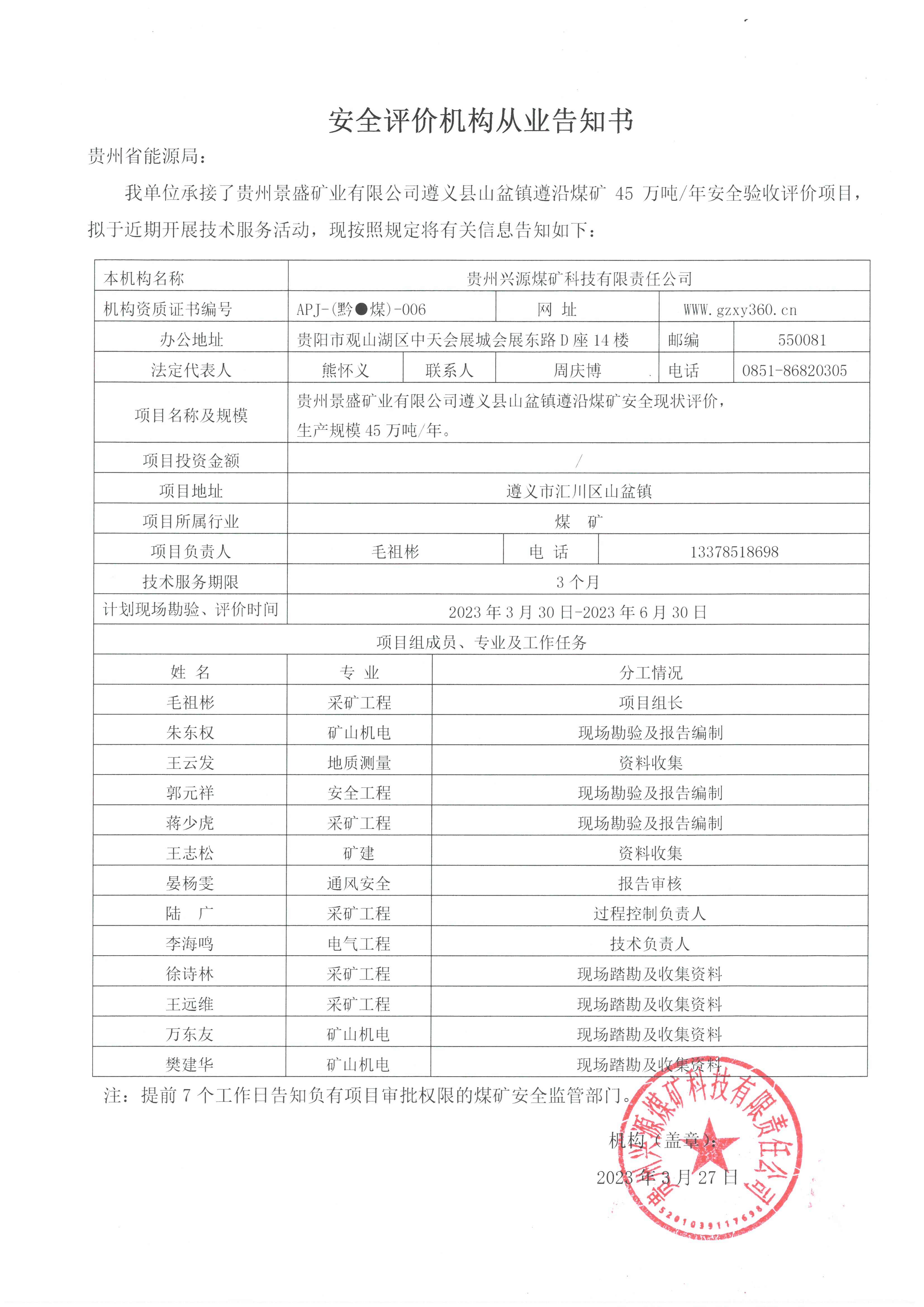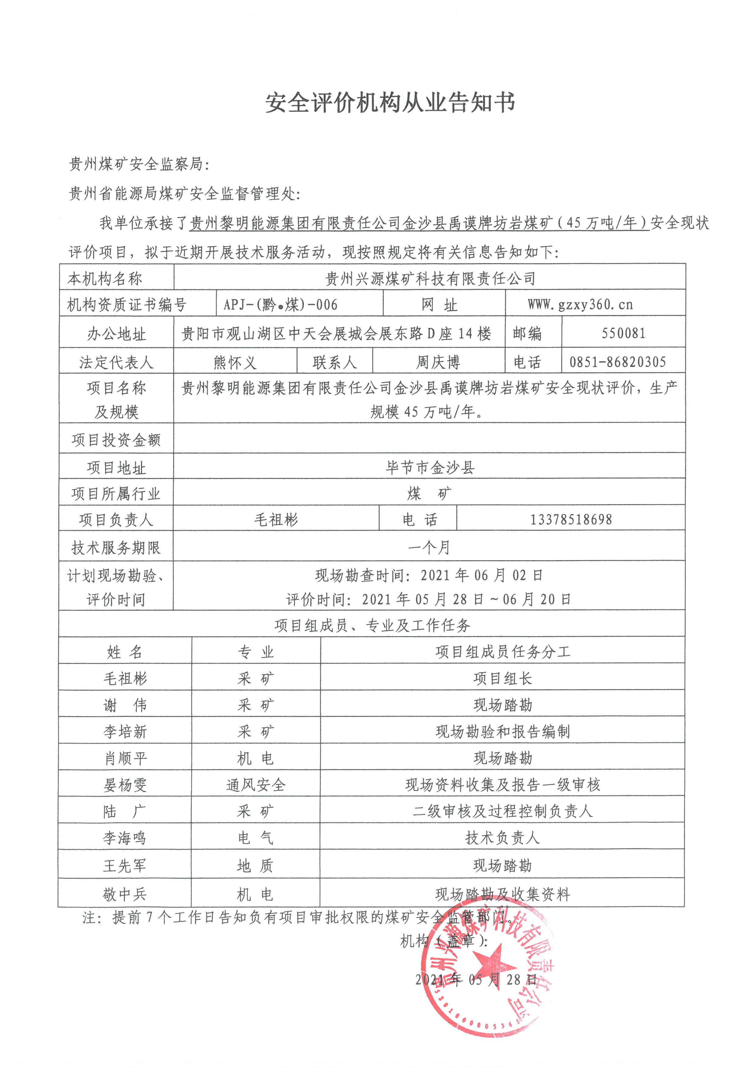 安全評(píng)價(jià)機(jī)構(gòu)從業(yè)告知書(貴州黎明能源集團(tuán)有限責(zé)任公司金沙縣禹謨牌坊巖煤礦安全現(xiàn)狀評(píng)價(jià))