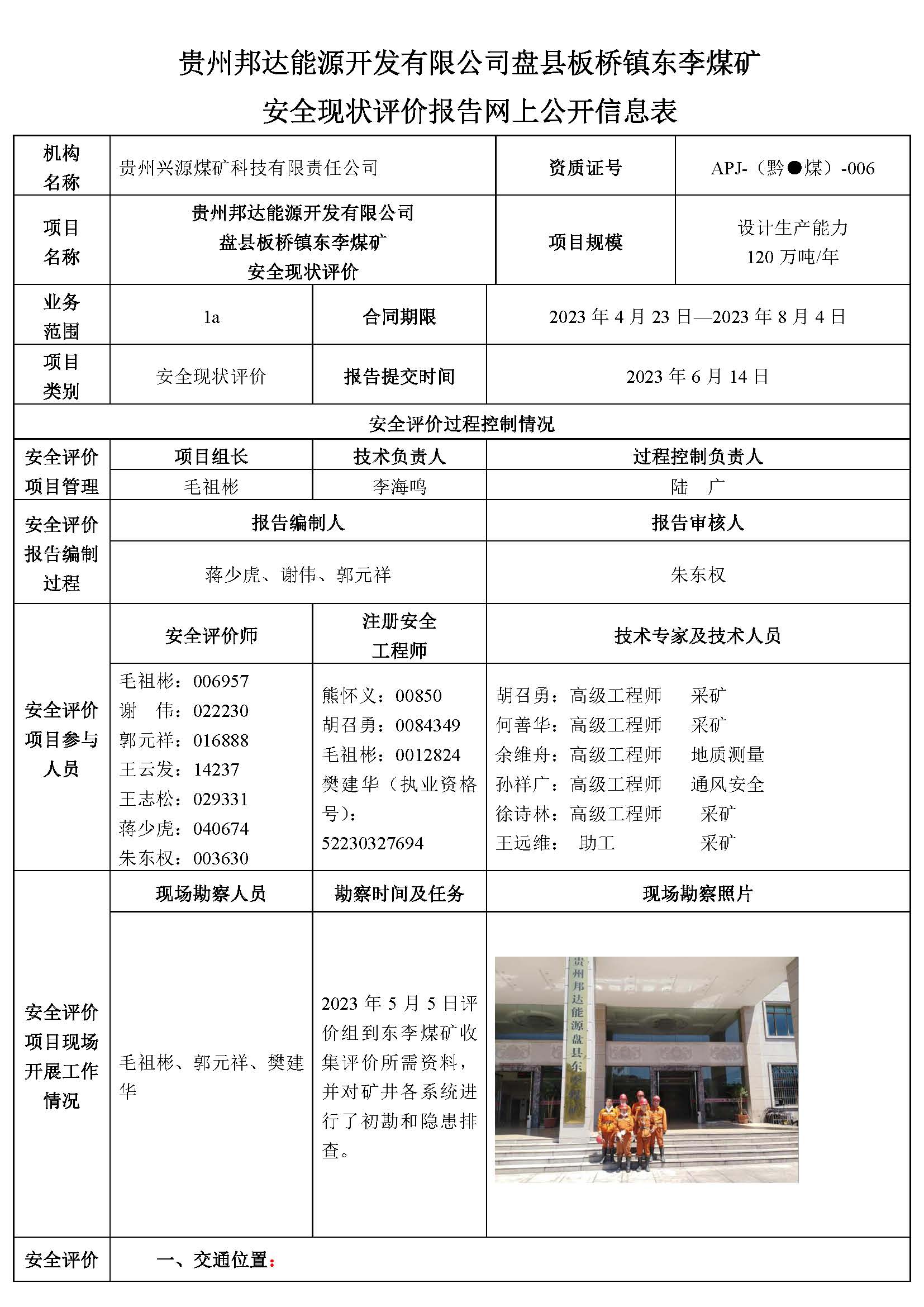 貴州邦達(dá)能源開發(fā)有限公司盤縣板橋鎮(zhèn)東李煤礦 安全現(xiàn)狀評(píng)價(jià)報(bào)告網(wǎng)上公開信息表