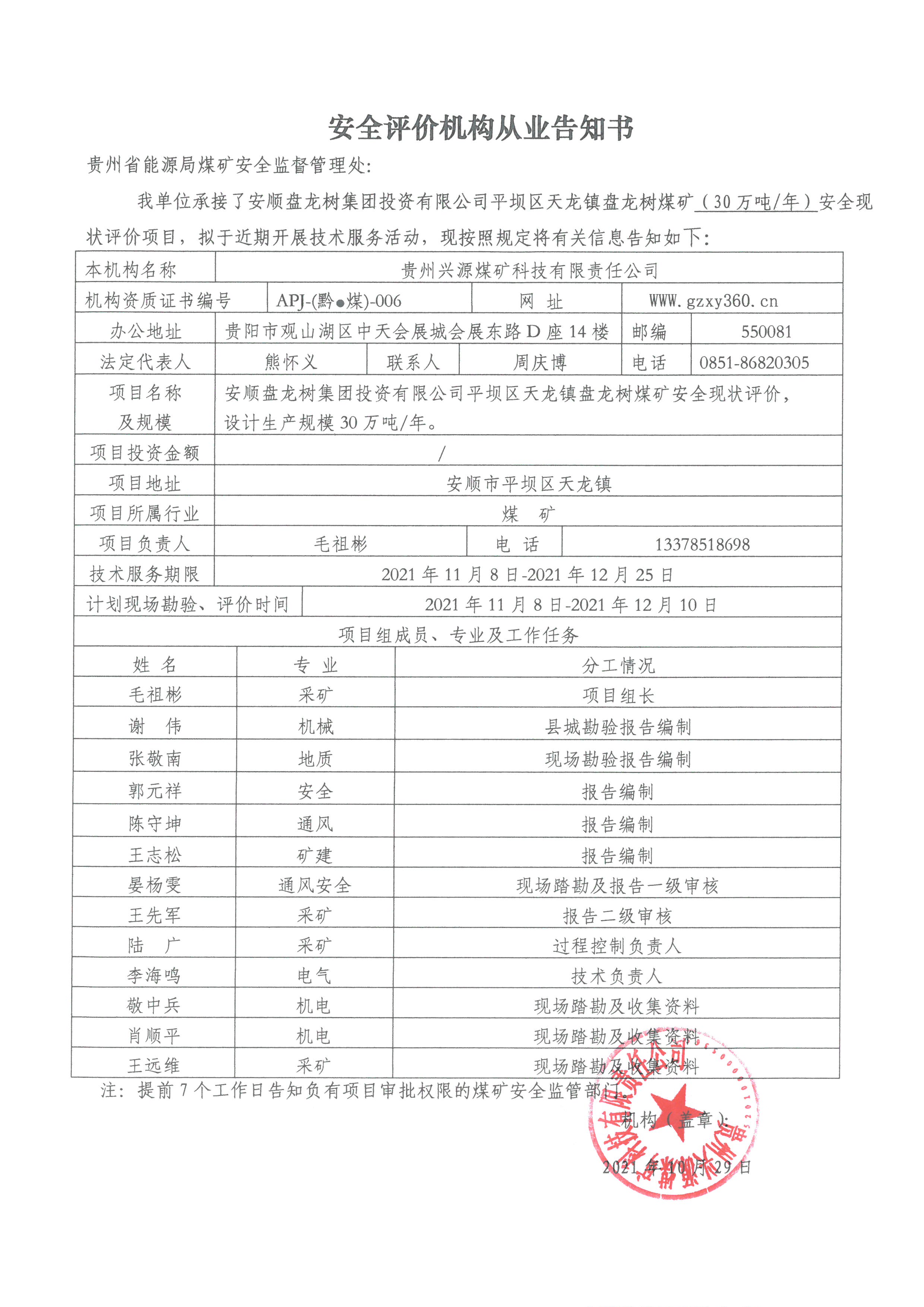 安全評價機構從業(yè)告知書(安順盤龍樹集團投資有限公司平壩區(qū)天龍鎮(zhèn)盤龍樹煤礦(30萬噸/年)安全現(xiàn)狀評價)