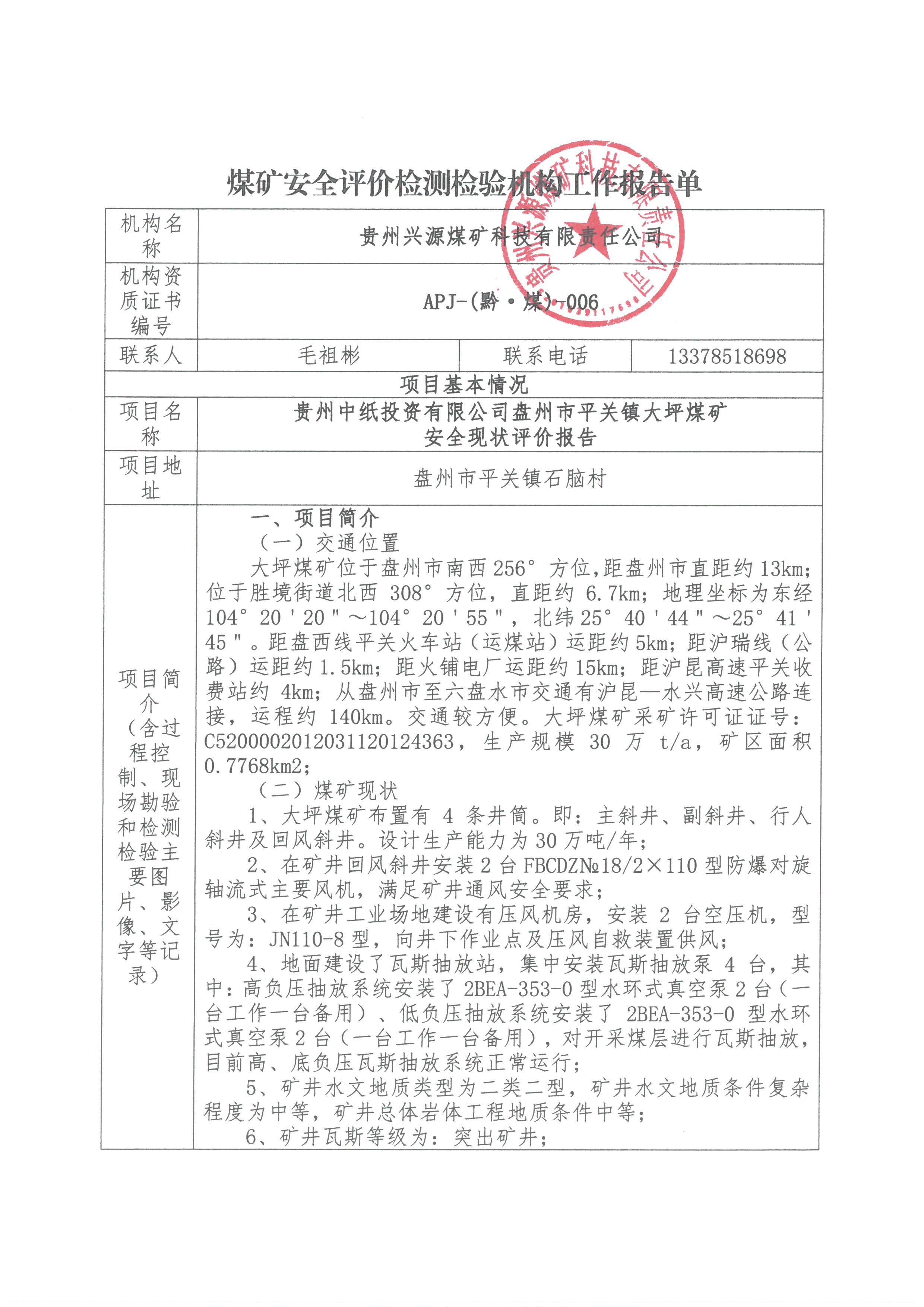 煤礦安全評價檢測檢驗機構工作報告單【貴州中紙投資有限公司 盤州市平關鎮(zhèn)大坪煤礦 安全現(xiàn)狀評價報告】