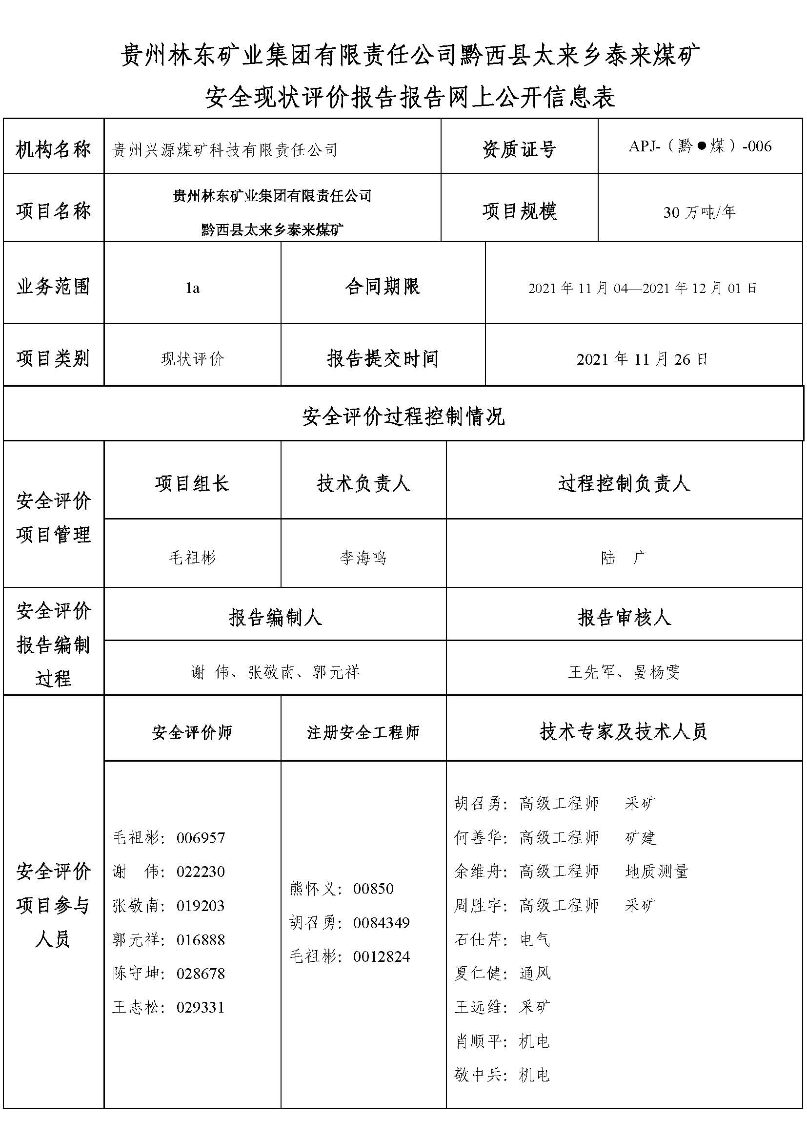 貴州林東礦業(yè)集團有限責任公司黔西縣太來鄉(xiāng)泰來煤礦 安全現(xiàn)狀評價報告報告網(wǎng)上公開信息表