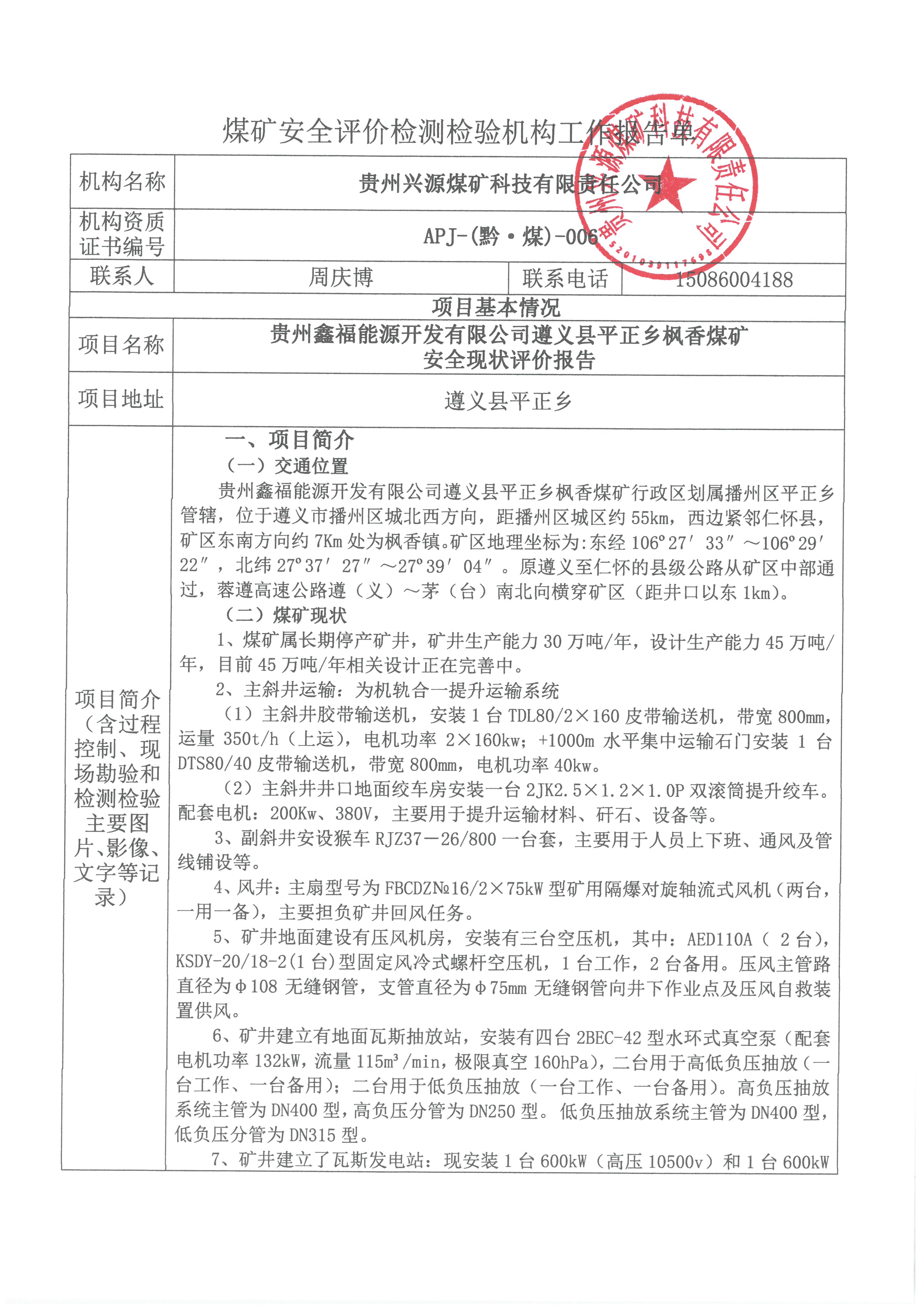 煤礦安全評價檢測檢驗機構(gòu)工作報告單【貴州鑫福能源開發(fā)有限公司遵義縣平正鄉(xiāng)楓香煤礦】安全現(xiàn)狀評價報告