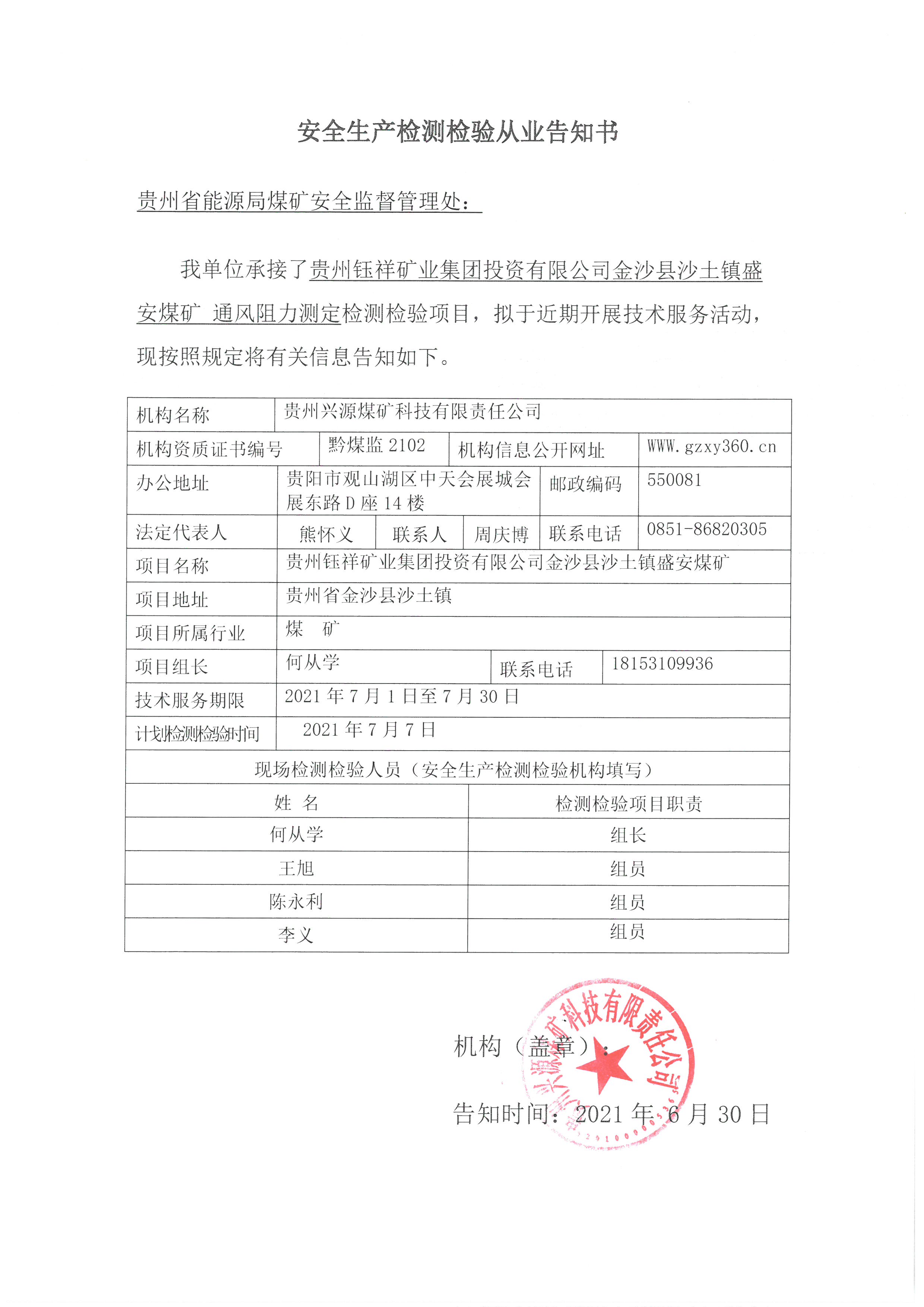 安全生產(chǎn)檢測檢驗從業(yè)告知書【貴州鈺祥礦業(yè)集團投資有限公司金沙縣沙土鎮(zhèn)盛安煤礦】