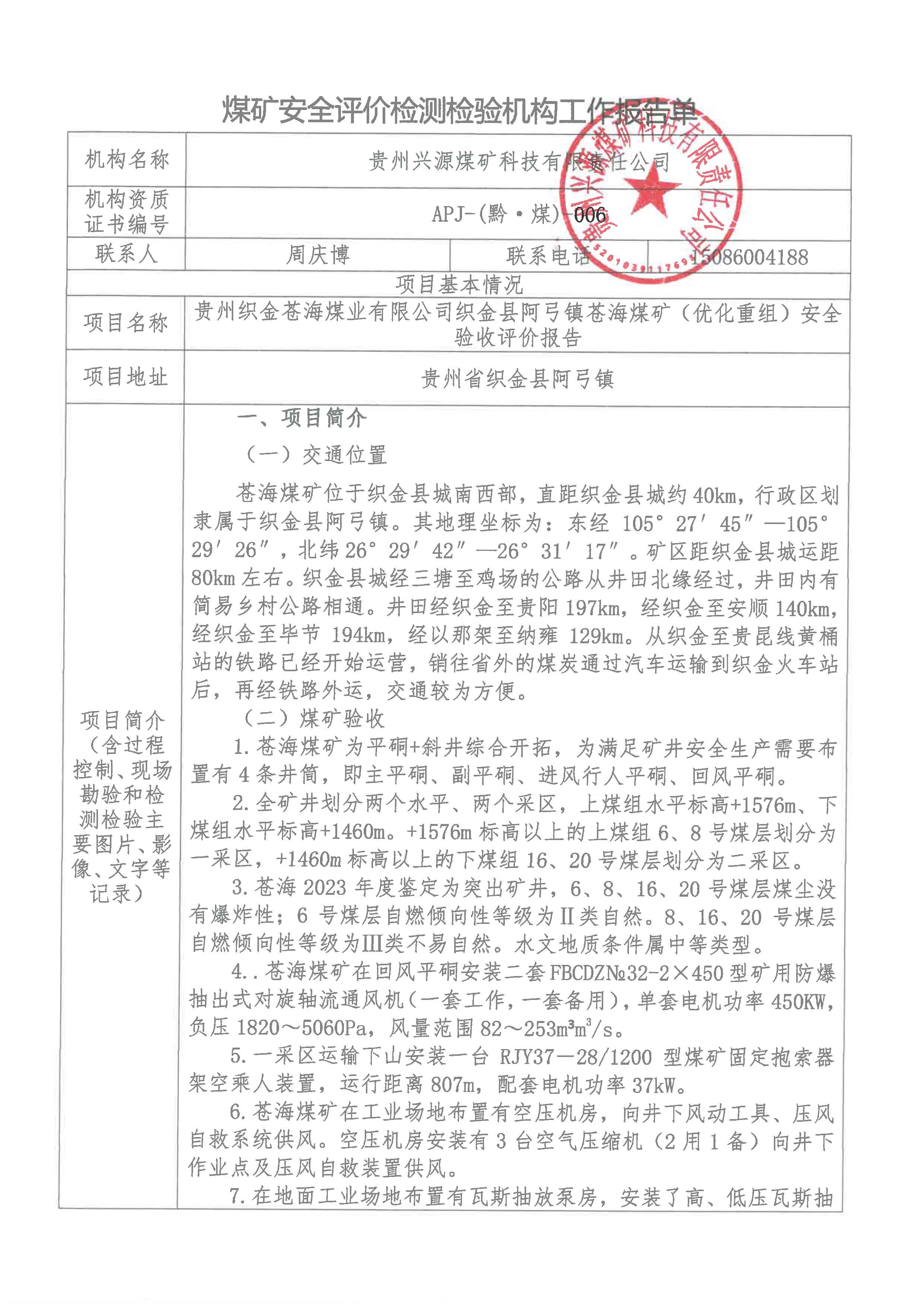 煤礦安全評價檢測檢驗(yàn)機(jī)構(gòu)工作報(bào)告單【貴州織金蒼海煤業(yè)有限公司織金縣阿弓鎮(zhèn)蒼海煤礦(優(yōu)化重組)安全驗(yàn)收評價報(bào)告】