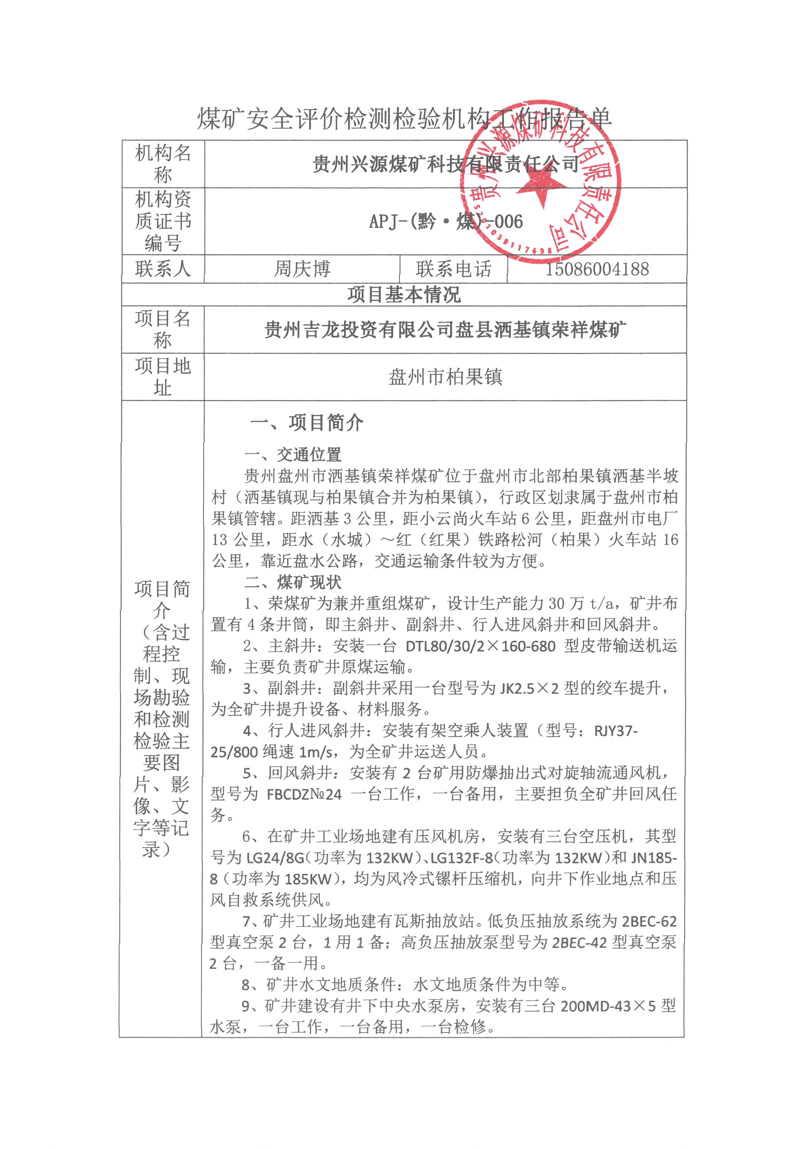 煤礦安全評(píng)價(jià)檢測(cè)檢驗(yàn)機(jī)構(gòu)工作報(bào)告單【貴州吉龍投資有限公司盤(pán)縣灑基鎮(zhèn)榮祥煤礦安全現(xiàn)狀評(píng)價(jià)】