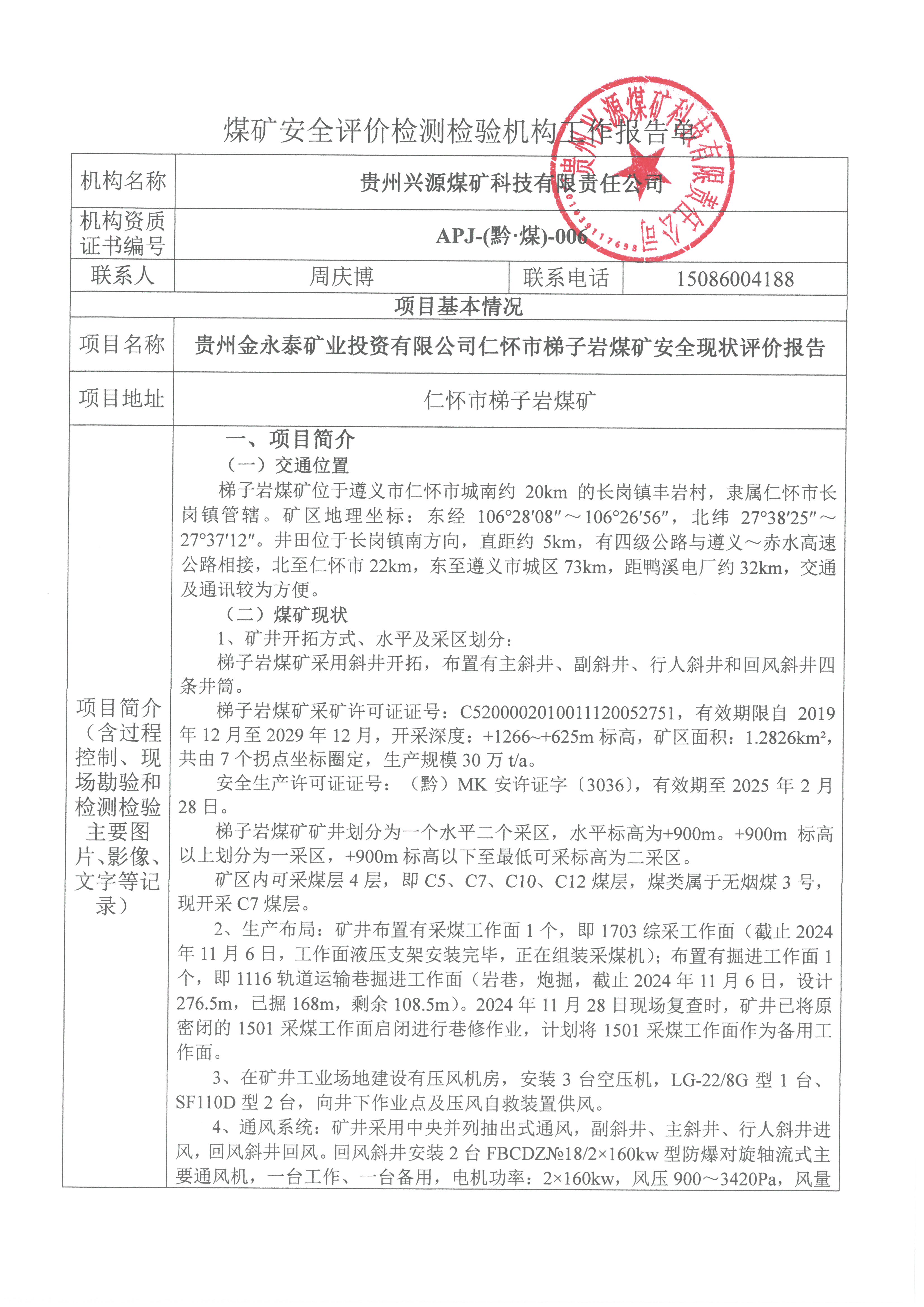煤礦安全評價(jià)檢測檢驗(yàn)機(jī)構(gòu)工作報(bào)告單【貴州金永泰礦業(yè)投資有限公司仁懷市梯子巖煤礦安全現(xiàn)狀評價(jià)報(bào)告】