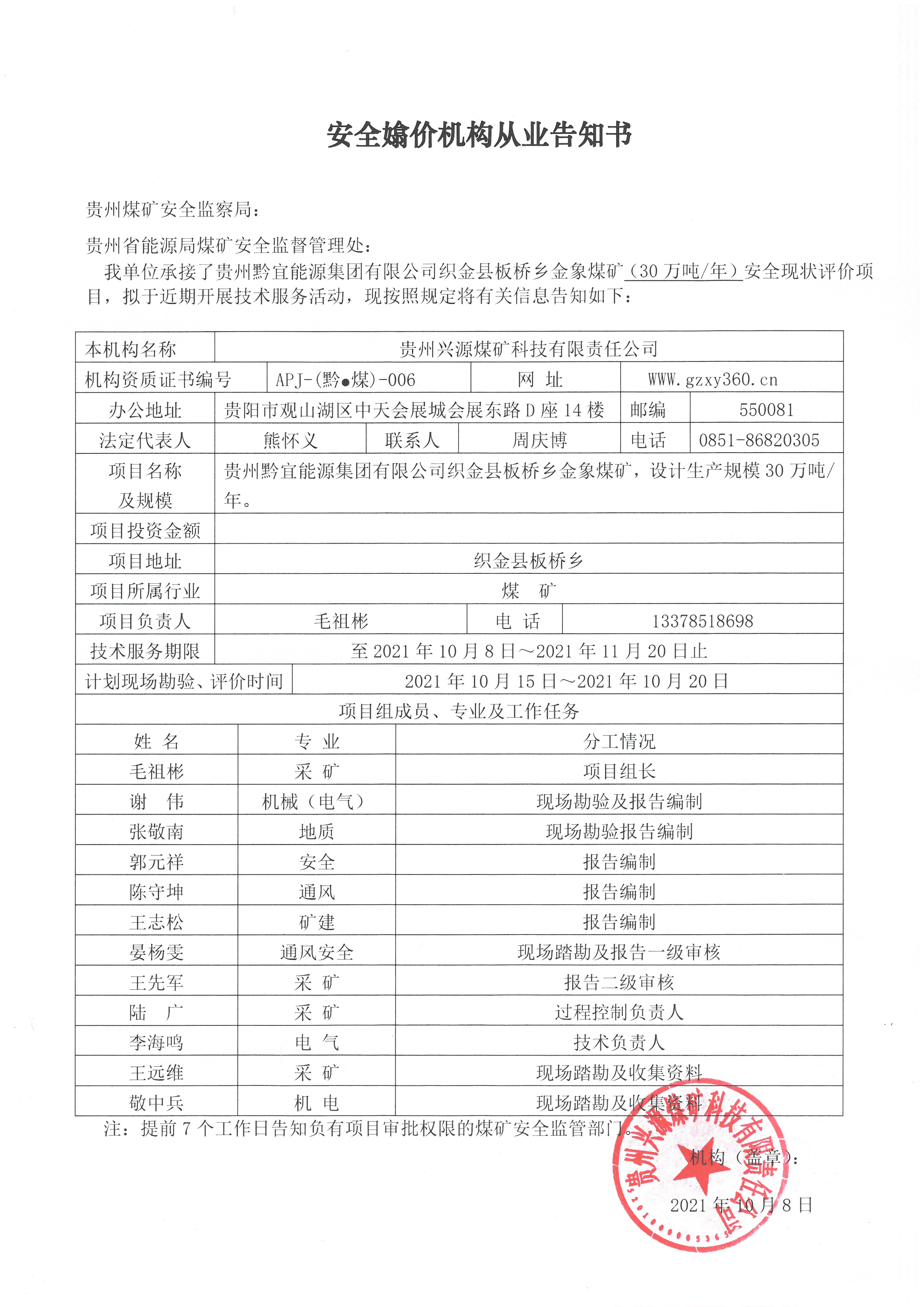 安全評(píng)價(jià)機(jī)構(gòu)從業(yè)告知書(貴州黔宜能源集團(tuán)有限公司織金縣板橋鄉(xiāng)金象煤礦(30萬(wàn)噸/年)安全現(xiàn)狀評(píng)價(jià))