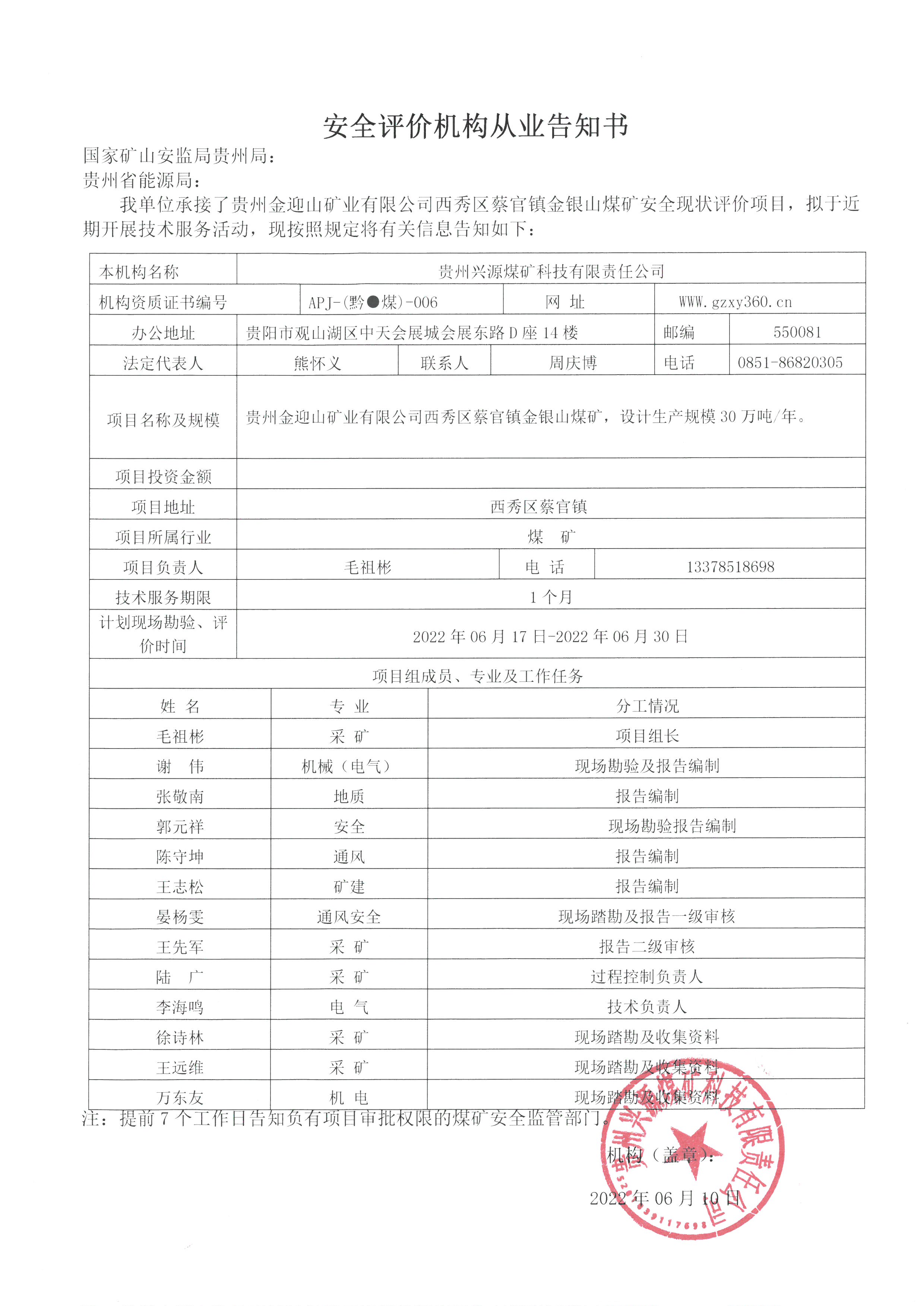 安全評(píng)價(jià)機(jī)構(gòu)從業(yè)告知書(貴州金迎山礦業(yè)有限公司西秀區(qū)蔡官鎮(zhèn)金銀山煤礦安全現(xiàn)狀評(píng)價(jià))