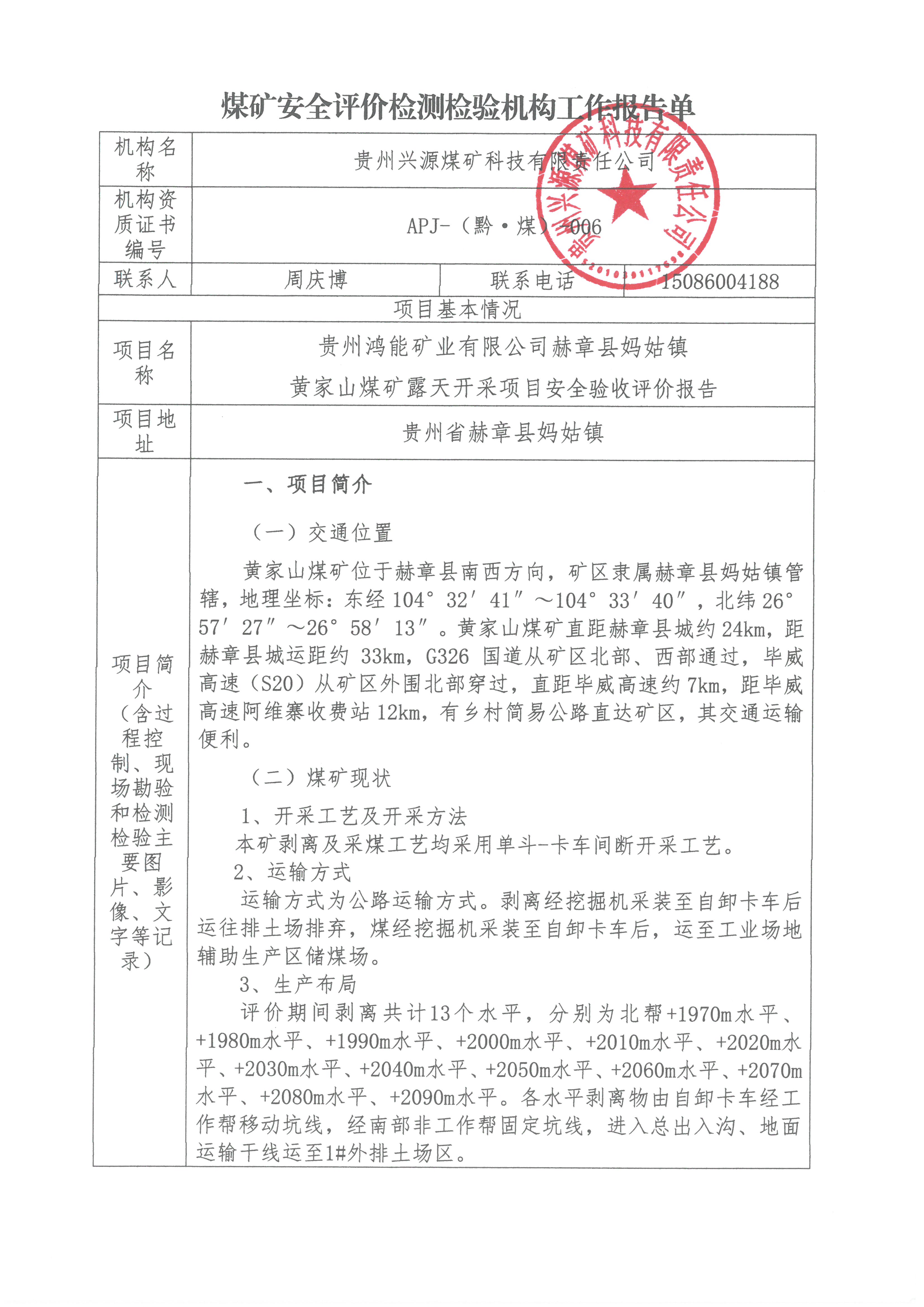 煤礦安全評(píng)價(jià)檢測(cè)檢驗(yàn)機(jī)構(gòu)工作報(bào)告單【貴州鴻能礦業(yè)有限公司赫章縣媽姑鎮(zhèn)黃家山煤礦露天開(kāi)采項(xiàng)目安全驗(yàn)收評(píng)價(jià)報(bào)告】