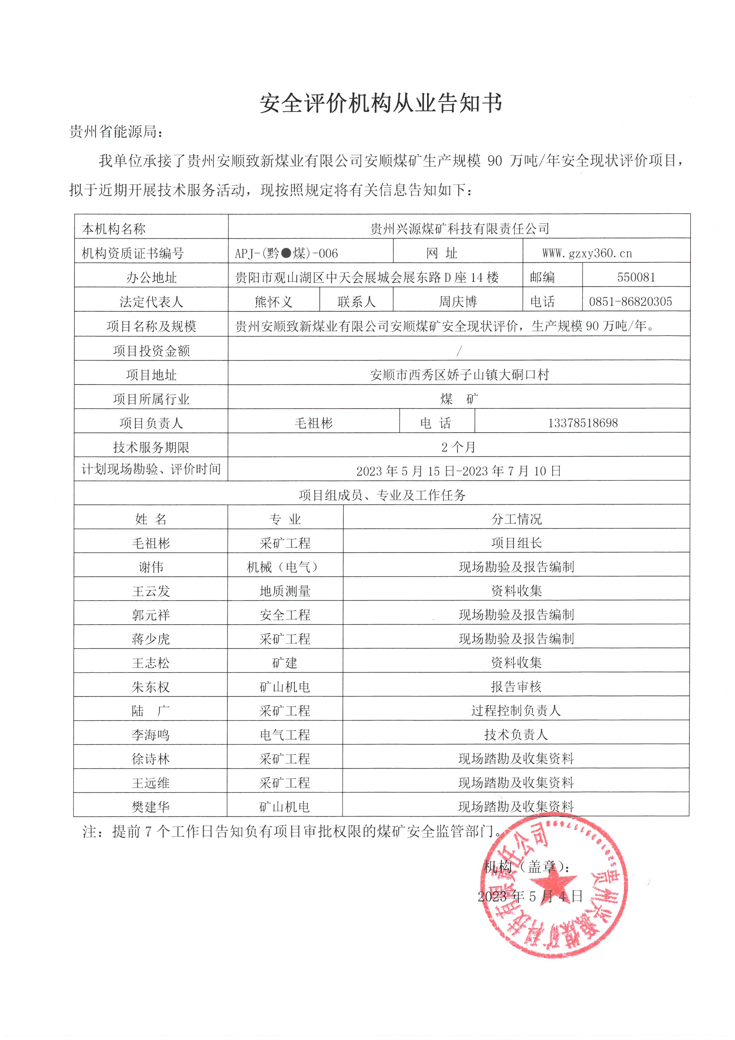 安全評(píng)價(jià)機(jī)構(gòu)從業(yè)告知書(shū)【貴州安順致新煤業(yè)有限公司安順煤礦】