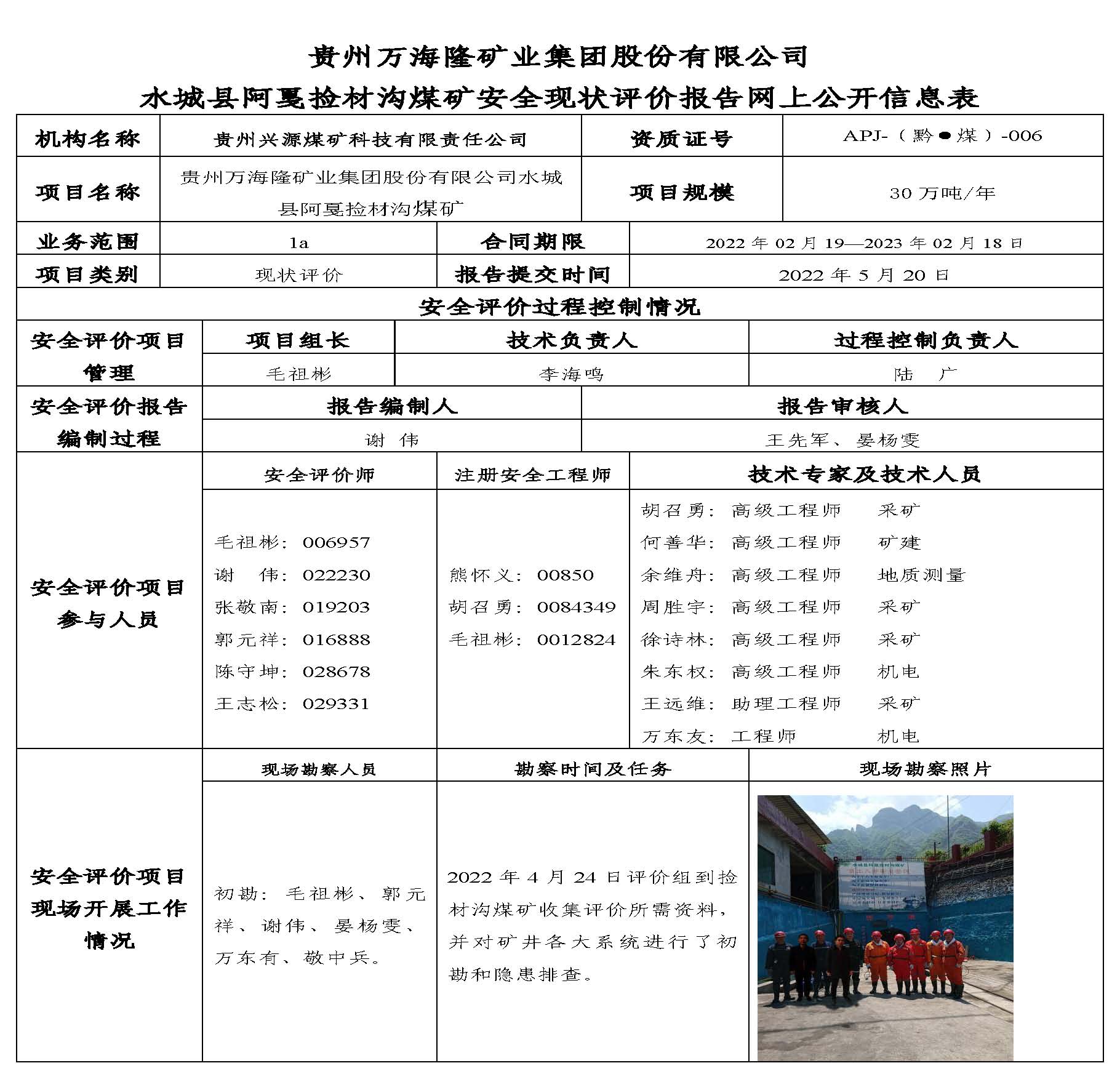 貴州萬海隆礦業(yè)集團股份有限公司水城縣阿戛撿材溝煤礦安全現(xiàn)狀評價報告網(wǎng)上公開信息表