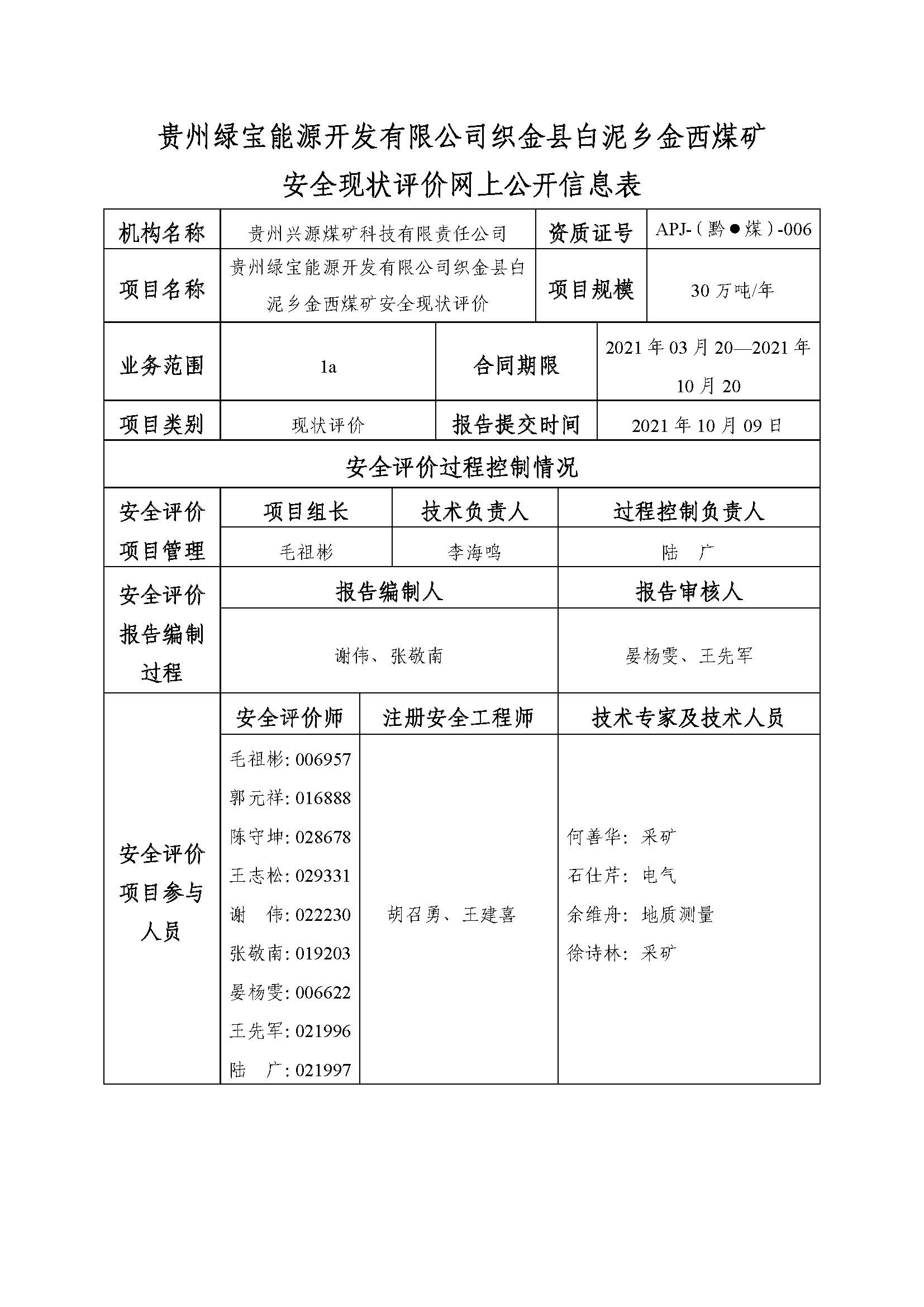 貴州綠寶能源開發(fā)有限公司織金縣白泥鄉(xiāng)金西煤礦安全現(xiàn)狀評價(jià)網(wǎng)上公開信息表