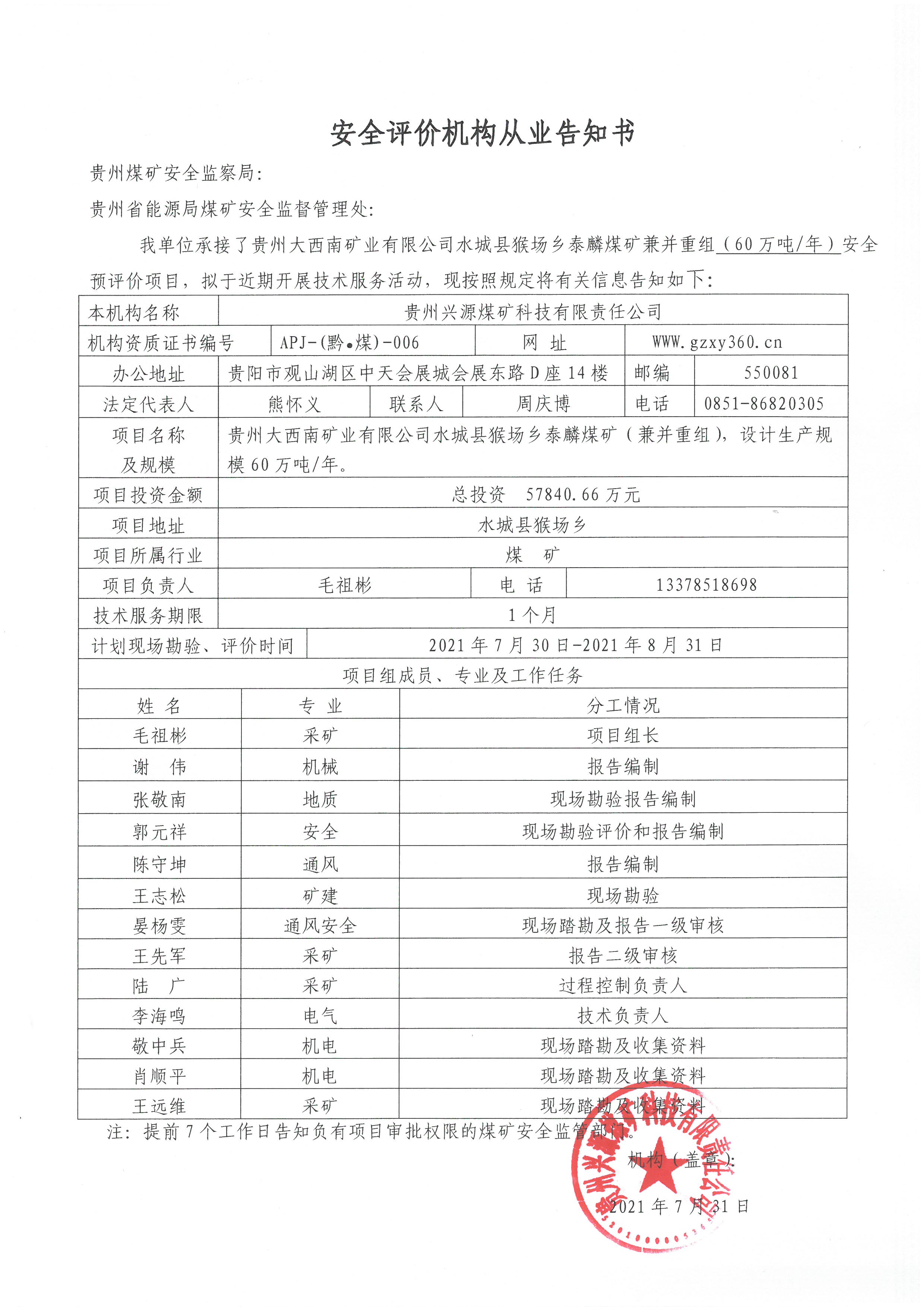 安全評(píng)價(jià)機(jī)構(gòu)從業(yè)告知書(貴州大西南礦業(yè)有限公司水城縣猴場(chǎng)鄉(xiāng)泰麟煤礦兼并重組(60萬噸年)安全預(yù)評(píng)價(jià))