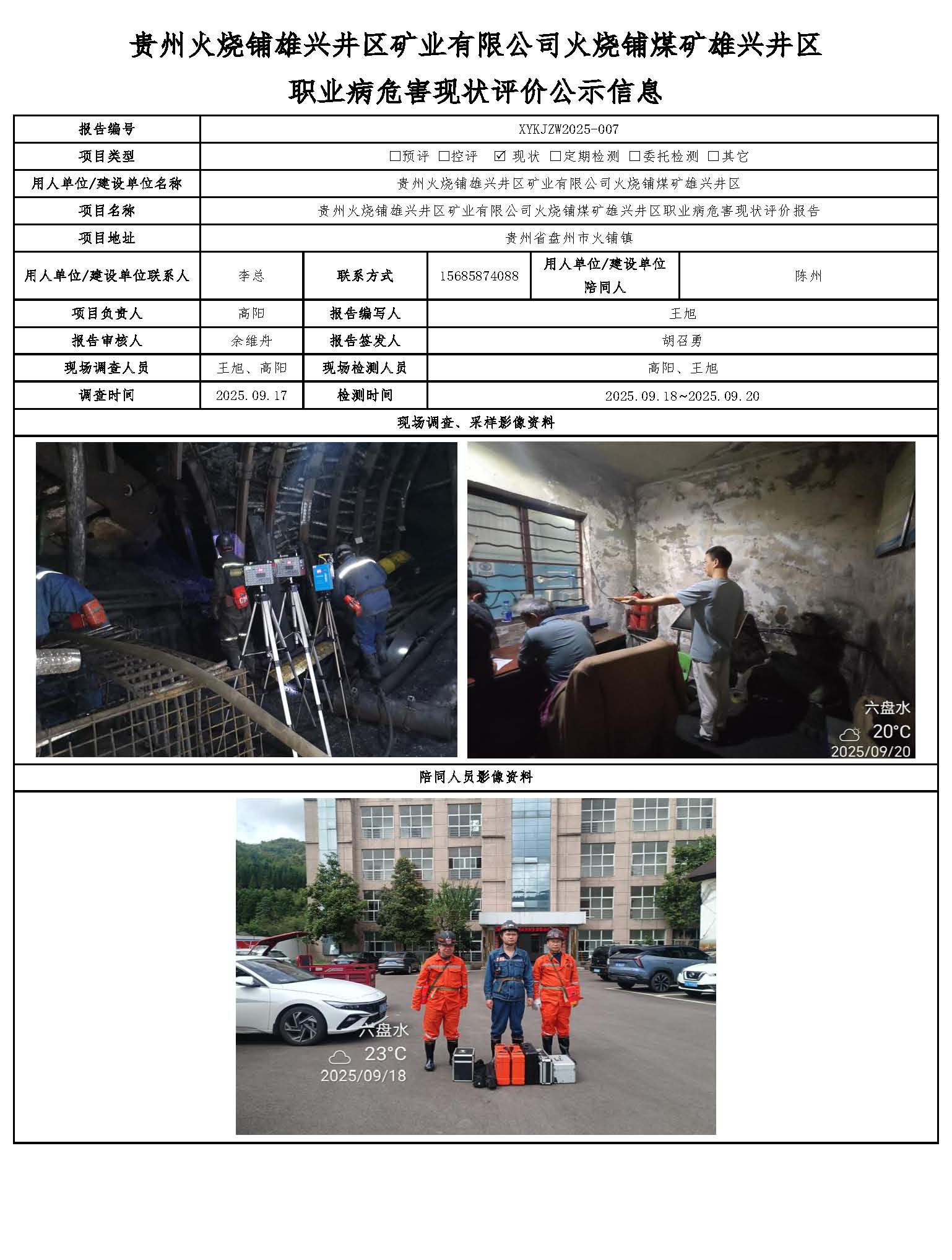 貴州火燒鋪雄興井區(qū)礦業(yè)有限公司火燒鋪煤礦雄興井區(qū)職業(yè)病危害現(xiàn)狀評價公示信息