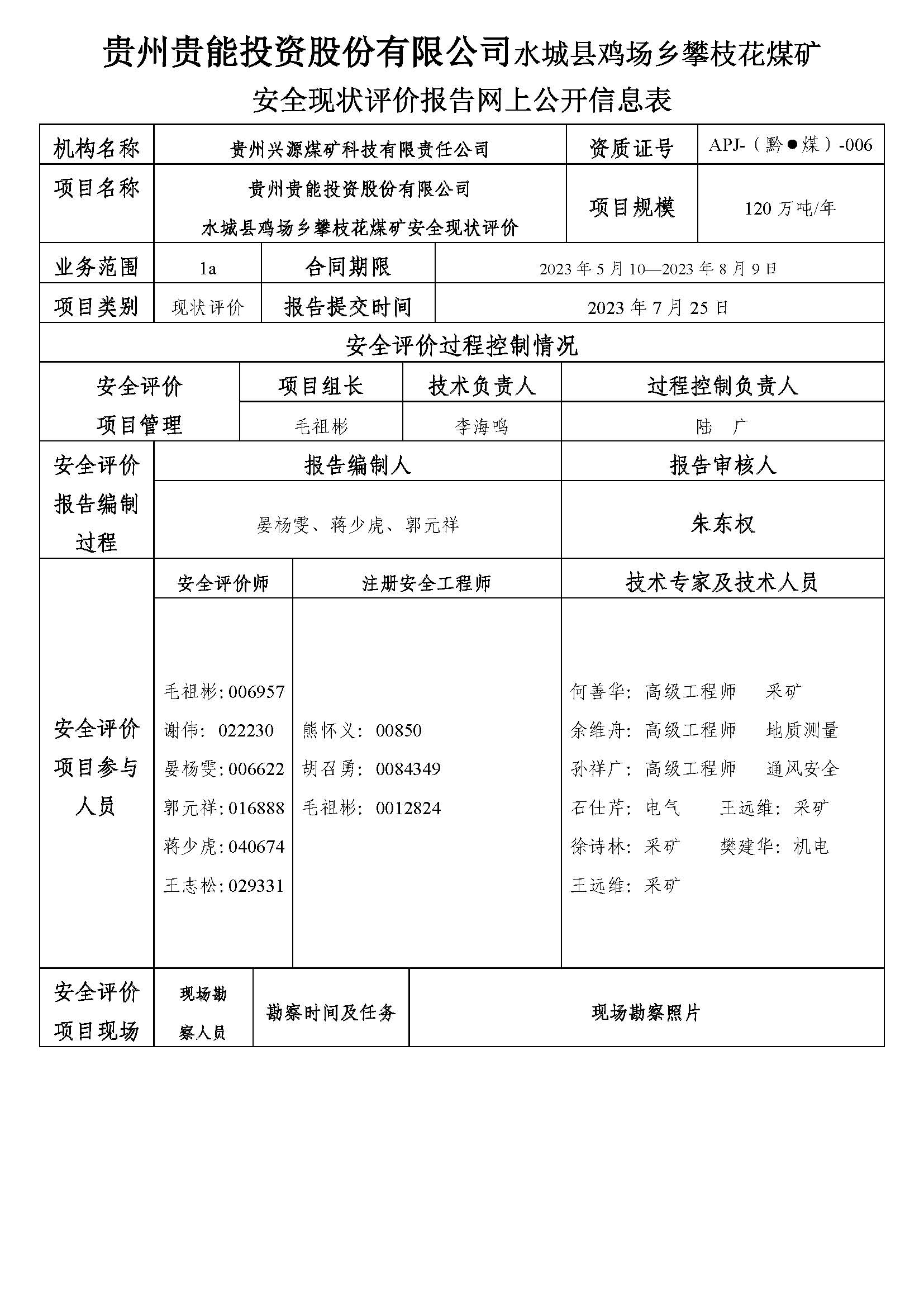 貴州貴能投資股份有限公司水城縣雞場(chǎng)鄉(xiāng)攀枝花煤礦安全現(xiàn)狀評(píng)價(jià)報(bào)告網(wǎng)上公開(kāi)信息表
