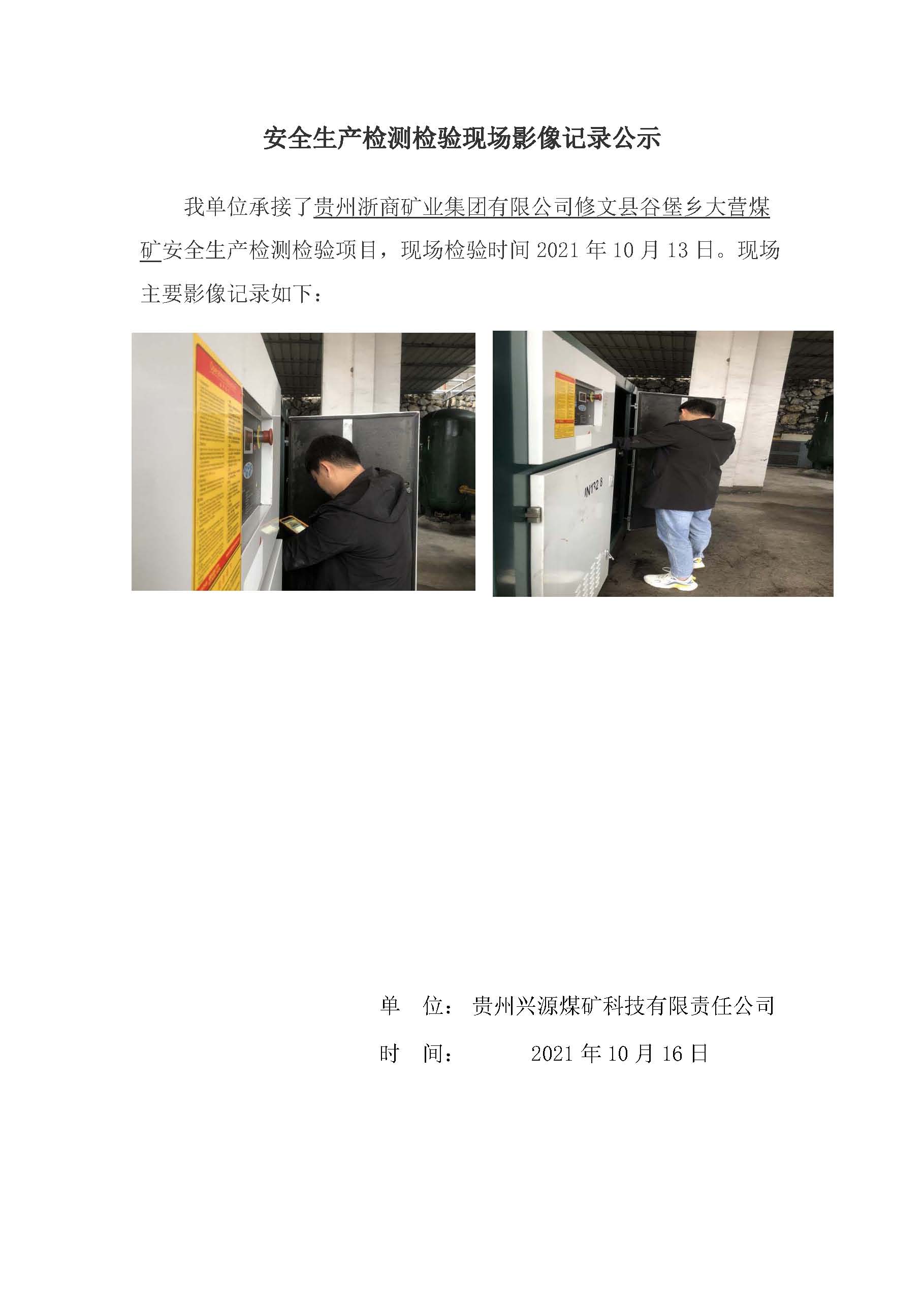 安全生產(chǎn)檢測(cè)檢驗(yàn)現(xiàn)場(chǎng)影像記錄公示【貴州浙商礦業(yè)集團(tuán)有限公司修文縣谷堡鄉(xiāng)大營(yíng)煤礦】