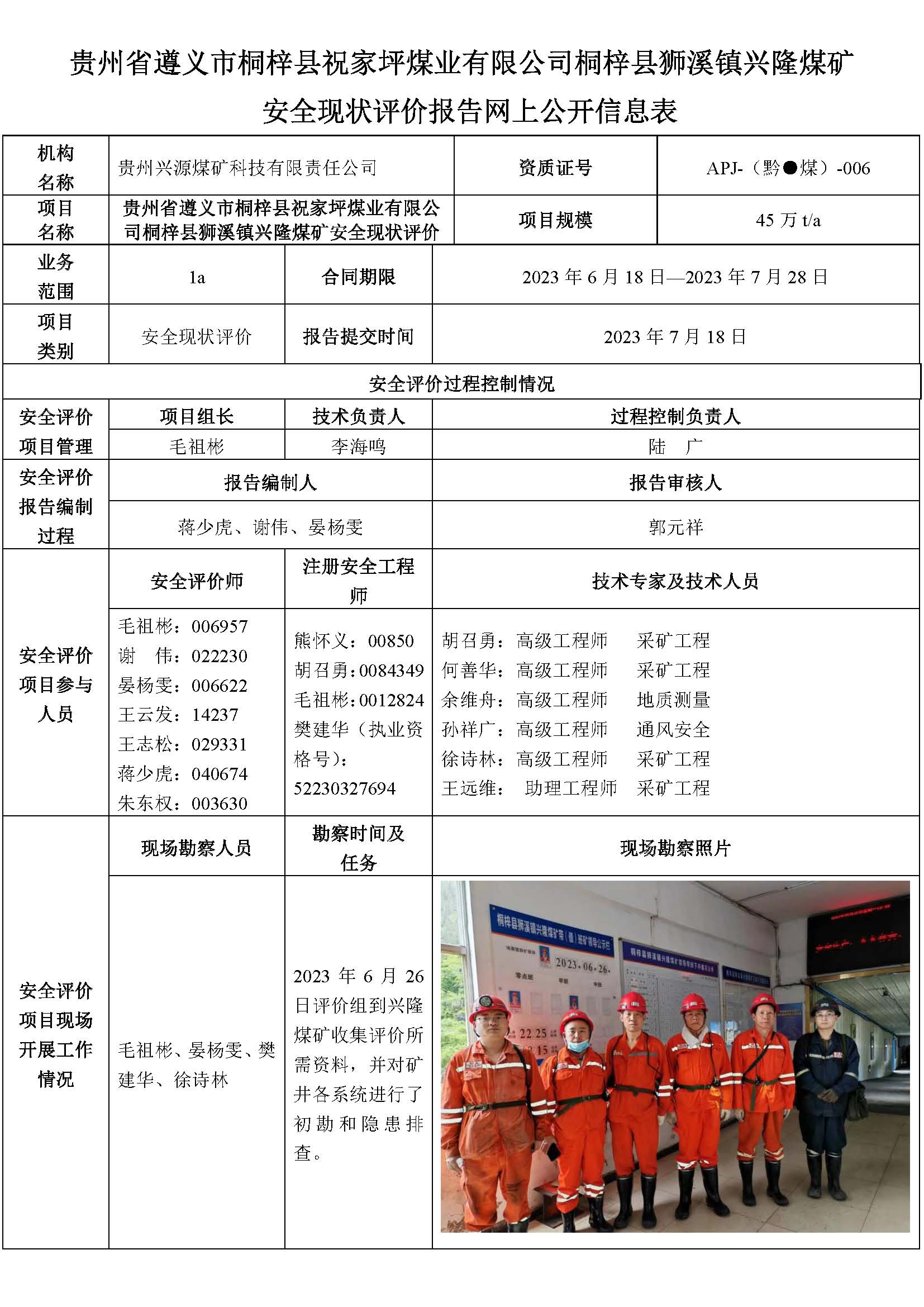 貴州省遵義市桐梓縣祝家坪煤業(yè)有限公司桐梓縣獅溪鎮(zhèn)興隆煤礦 安全現(xiàn)狀評價報告網(wǎng)上公開信息表
