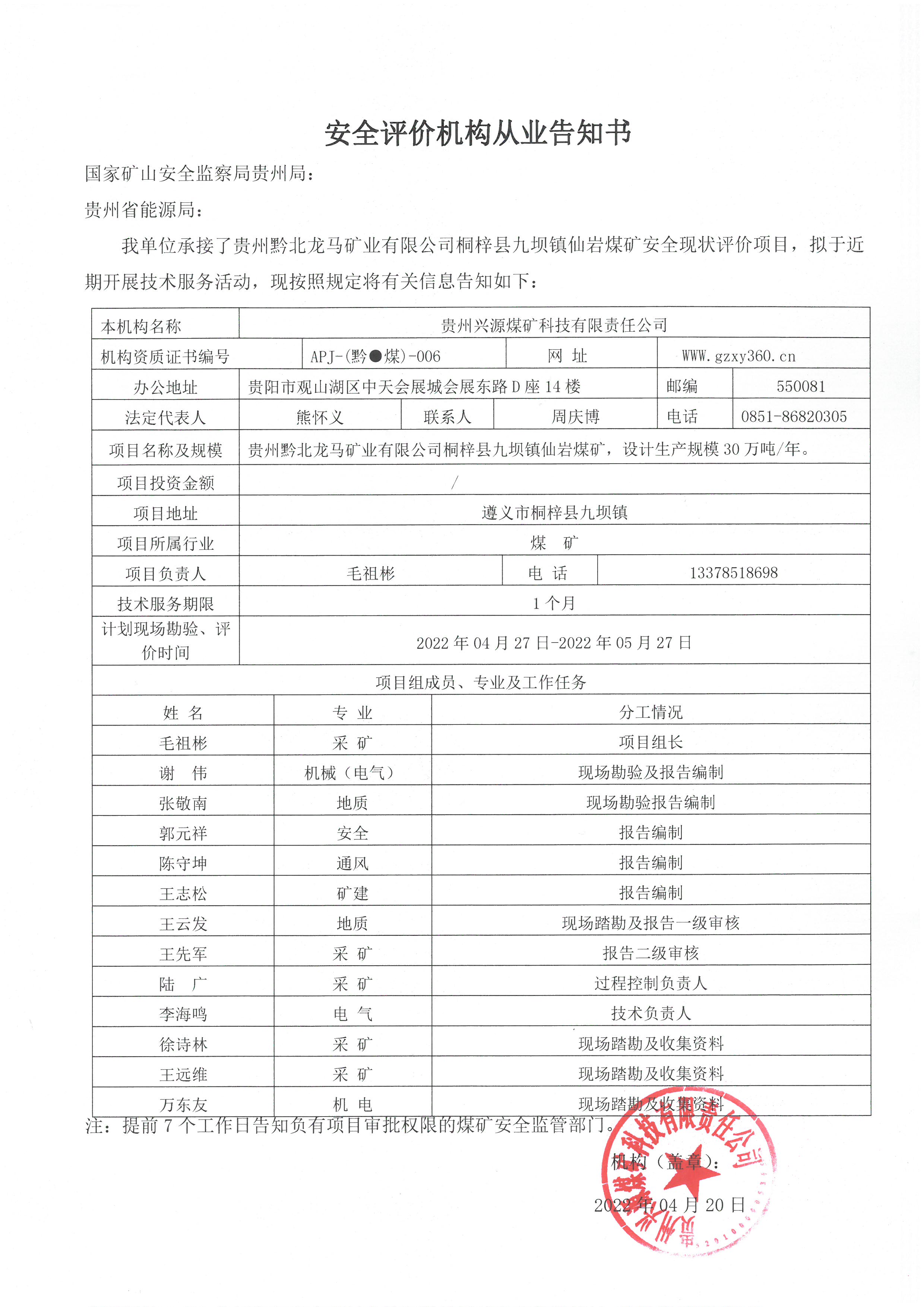 安全評價機構(gòu)從業(yè)告知書(貴州黔北龍馬礦業(yè)有限公司桐梓縣九壩鎮(zhèn)仙巖煤礦安全現(xiàn)狀評價項目)