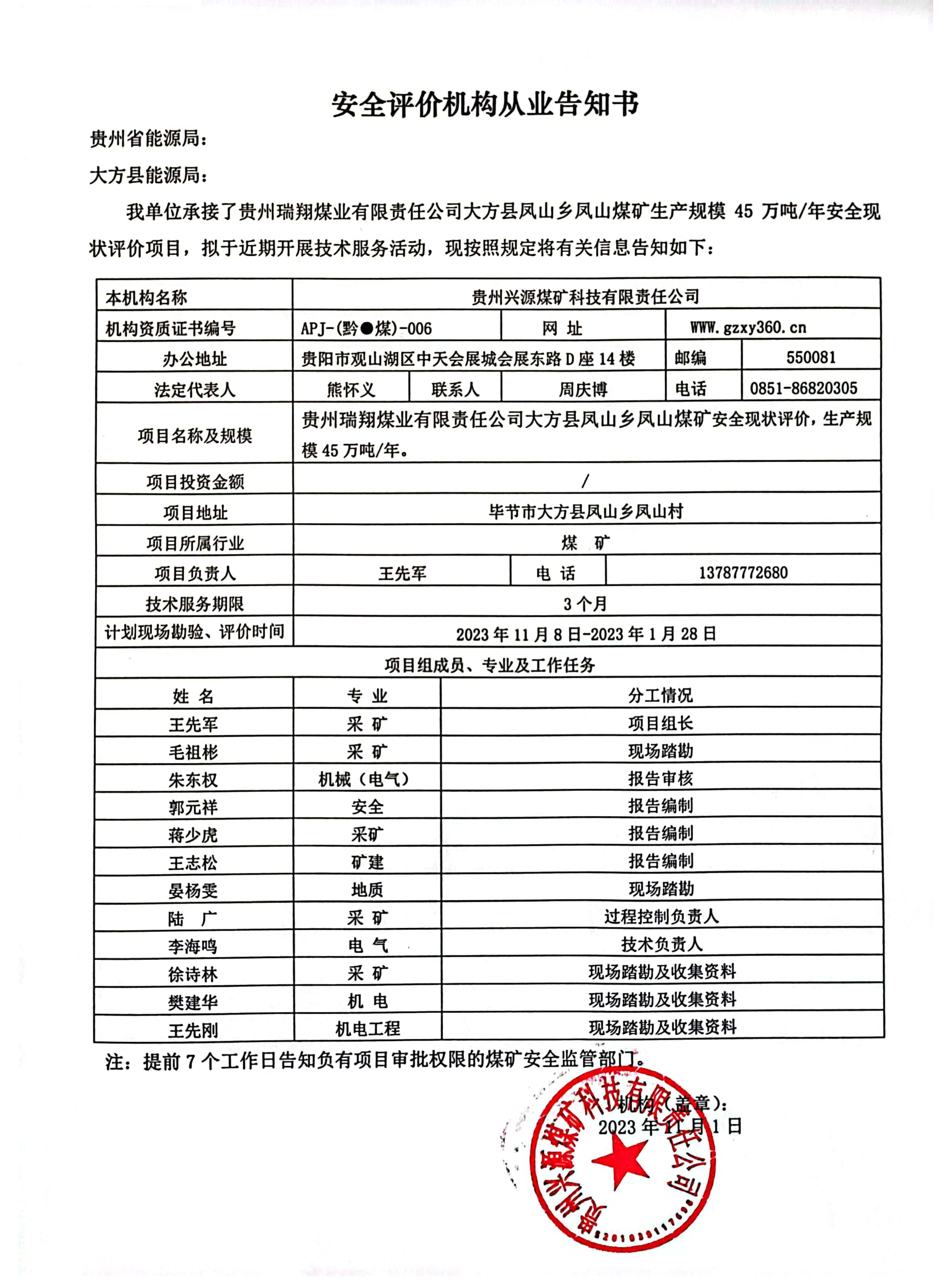 安全評價機構從業(yè)告知書[貴州瑞翔煤業(yè)有限責任公司大方縣鳳山鄉(xiāng)鳳山煤礦]