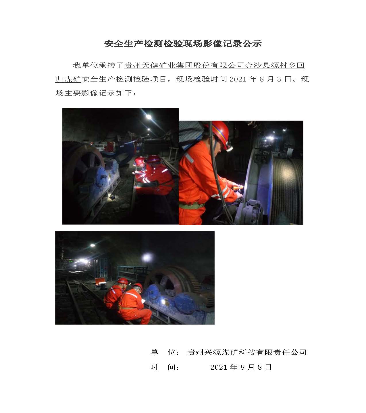 安全生產(chǎn)檢測檢驗現(xiàn)場影像記錄公示【貴州天健礦業(yè)集團股份有限公司金沙縣源村鄉(xiāng)田灣煤礦】