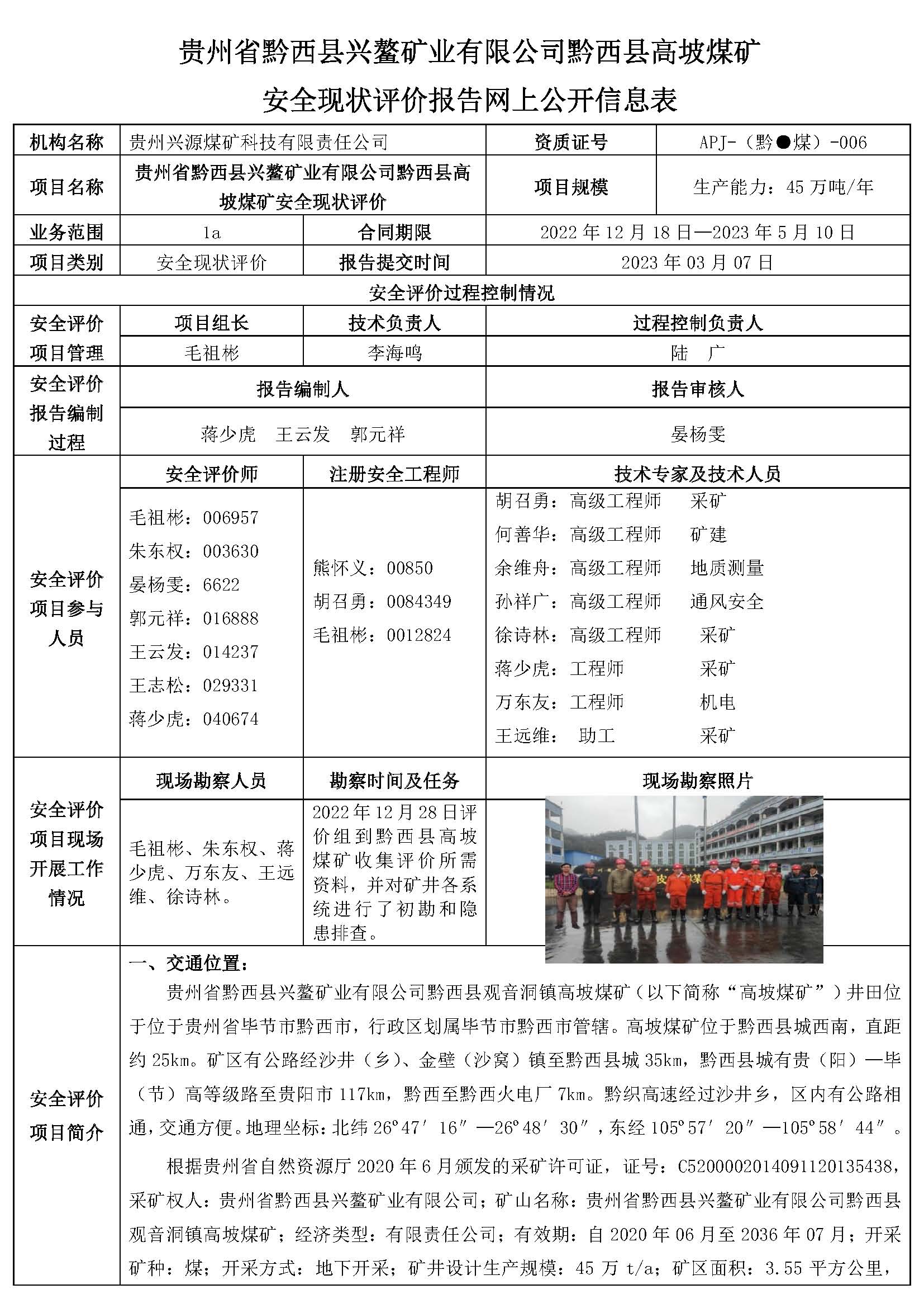 貴州省黔西縣興鰲礦業(yè)有限公司黔西縣高坡煤礦安全現(xiàn)狀評價報告網(wǎng)上公開信息表