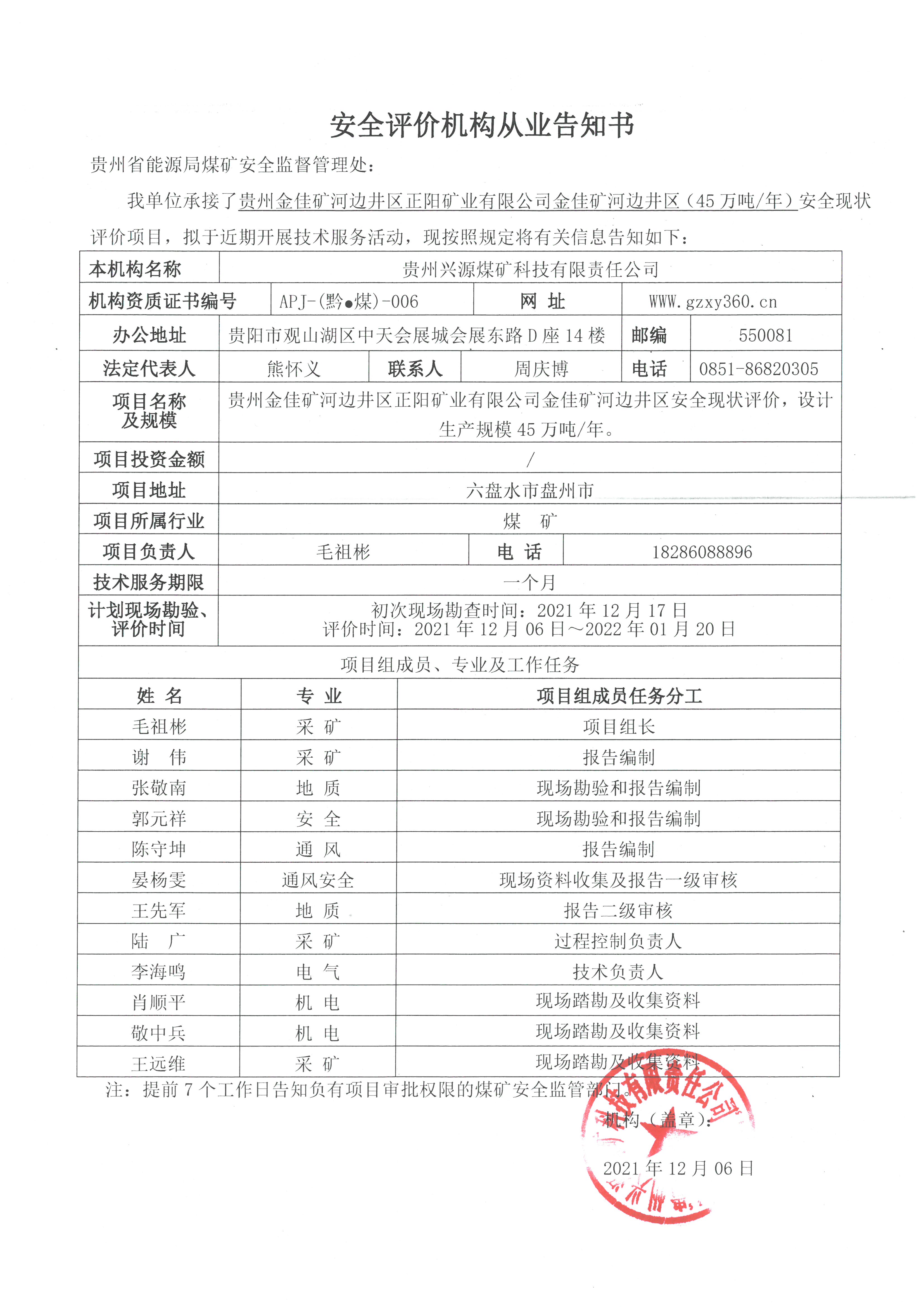 安全評(píng)價(jià)機(jī)構(gòu)從業(yè)告知書【貴州興騰礦業(yè)有限公司納雍縣勺窩鄉(xiāng)雍汪興騰煤礦一號(hào)井安全驗(yàn)收評(píng)價(jià)項(xiàng)目】