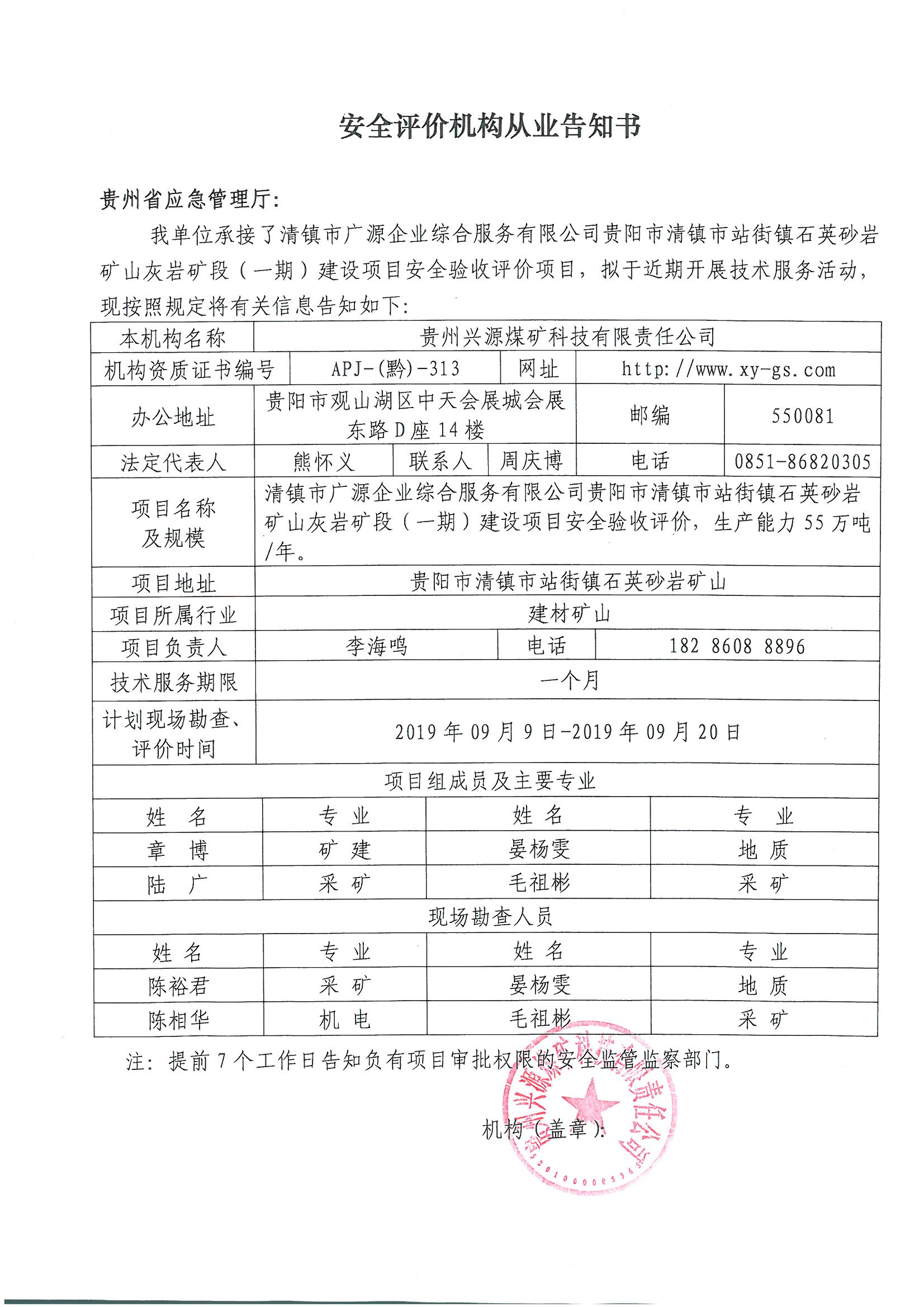 安全評價機構從業(yè)告知書【清鎮(zhèn)市廣源企業(yè)綜合服務有限公司貴陽市清鎮(zhèn)市站街鎮(zhèn)石英砂巖礦山灰?guī)r礦段(一)期建設項目】