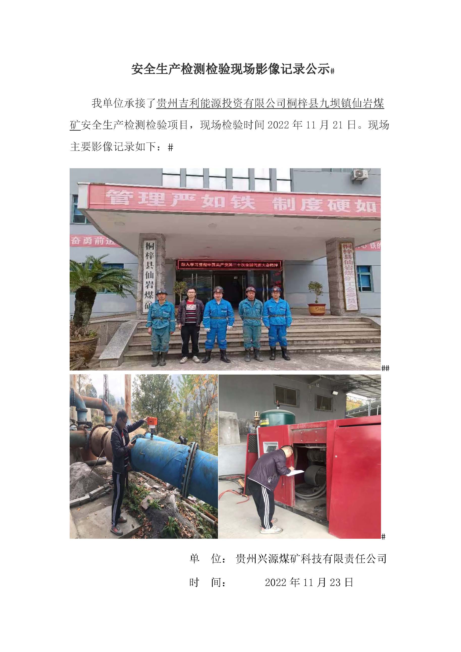 安全生產(chǎn)檢測檢驗現(xiàn)場影像記錄公示【貴州吉利能源投資有限公司桐梓縣九壩鎮(zhèn)仙巖煤礦】