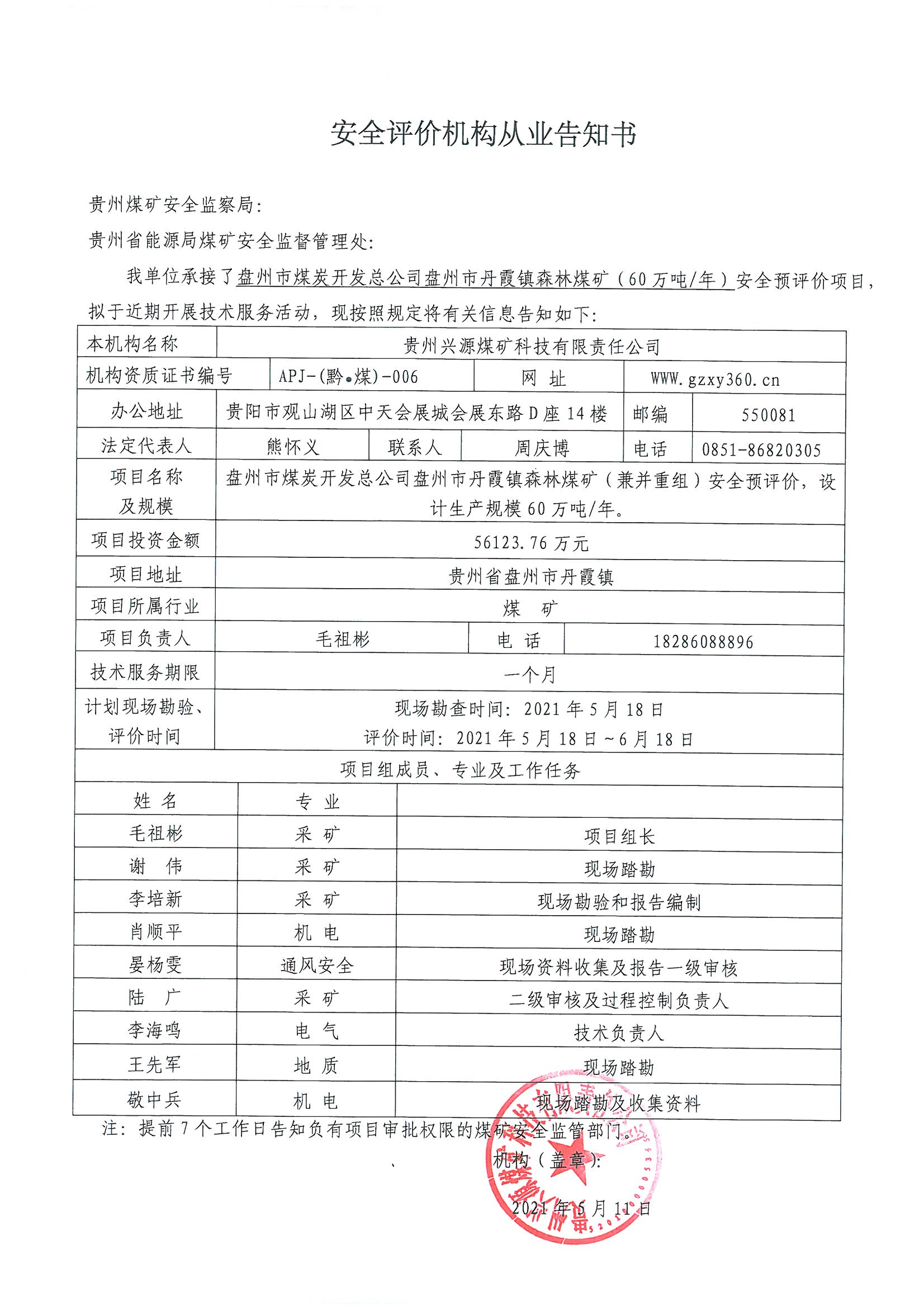 安全評(píng)價(jià)機(jī)構(gòu)從業(yè)告知書(盤州市煤炭開發(fā)總公司盤州市丹霞鎮(zhèn)森林煤礦(60萬噸年)安全預(yù)評(píng)價(jià))