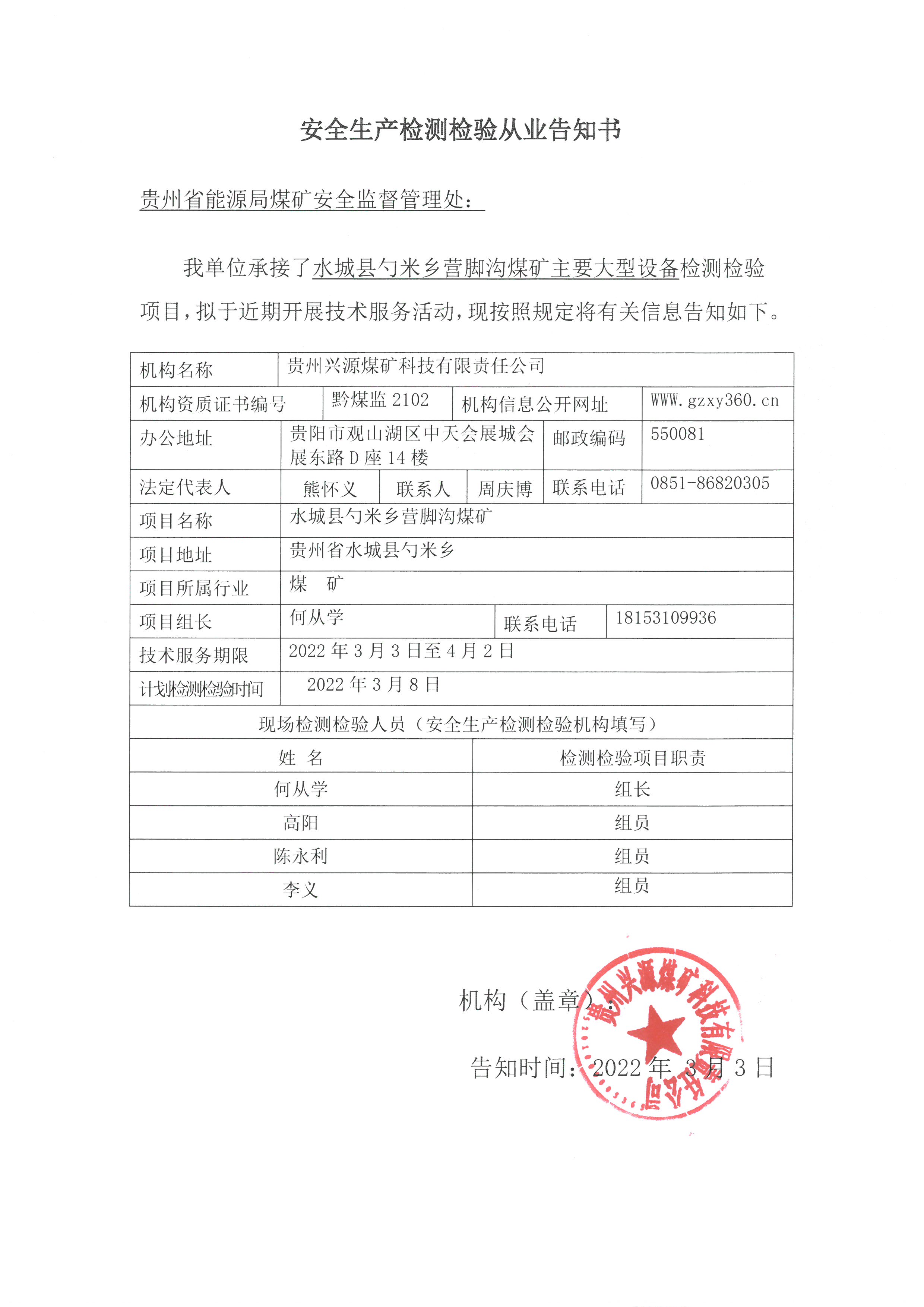 安全生產(chǎn)檢測(cè)檢驗(yàn)從業(yè)告知書(shū) 【水城縣勺米鄉(xiāng)營(yíng)腳溝煤礦主要大型設(shè)備檢測(cè)檢驗(yàn)項(xiàng)目】