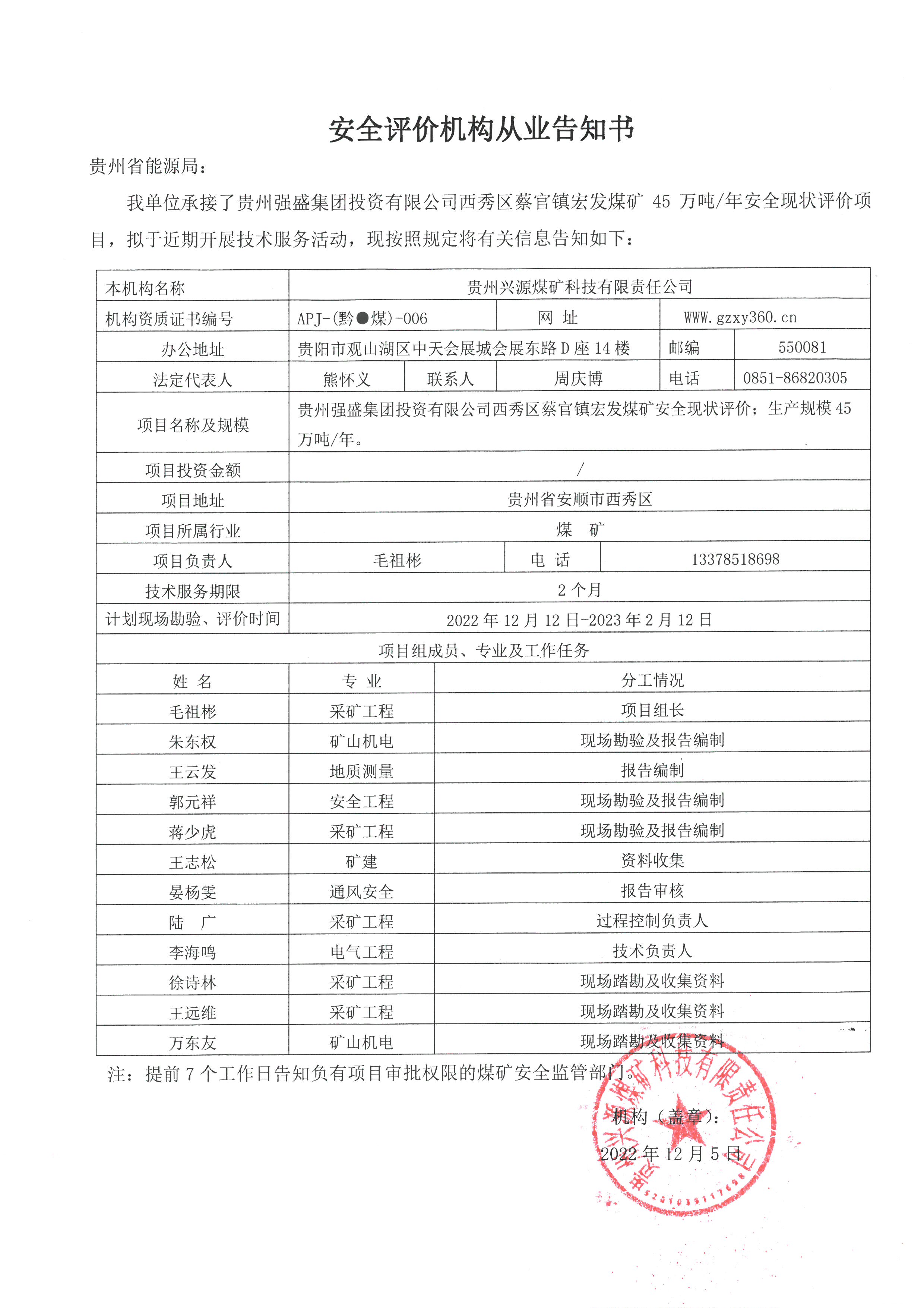 煤礦安全評(píng)價(jià)機(jī)構(gòu)從業(yè)告知書【貴州強(qiáng)盛集團(tuán)投資有限公司西秀區(qū)蔡官鎮(zhèn)宏發(fā)煤礦】