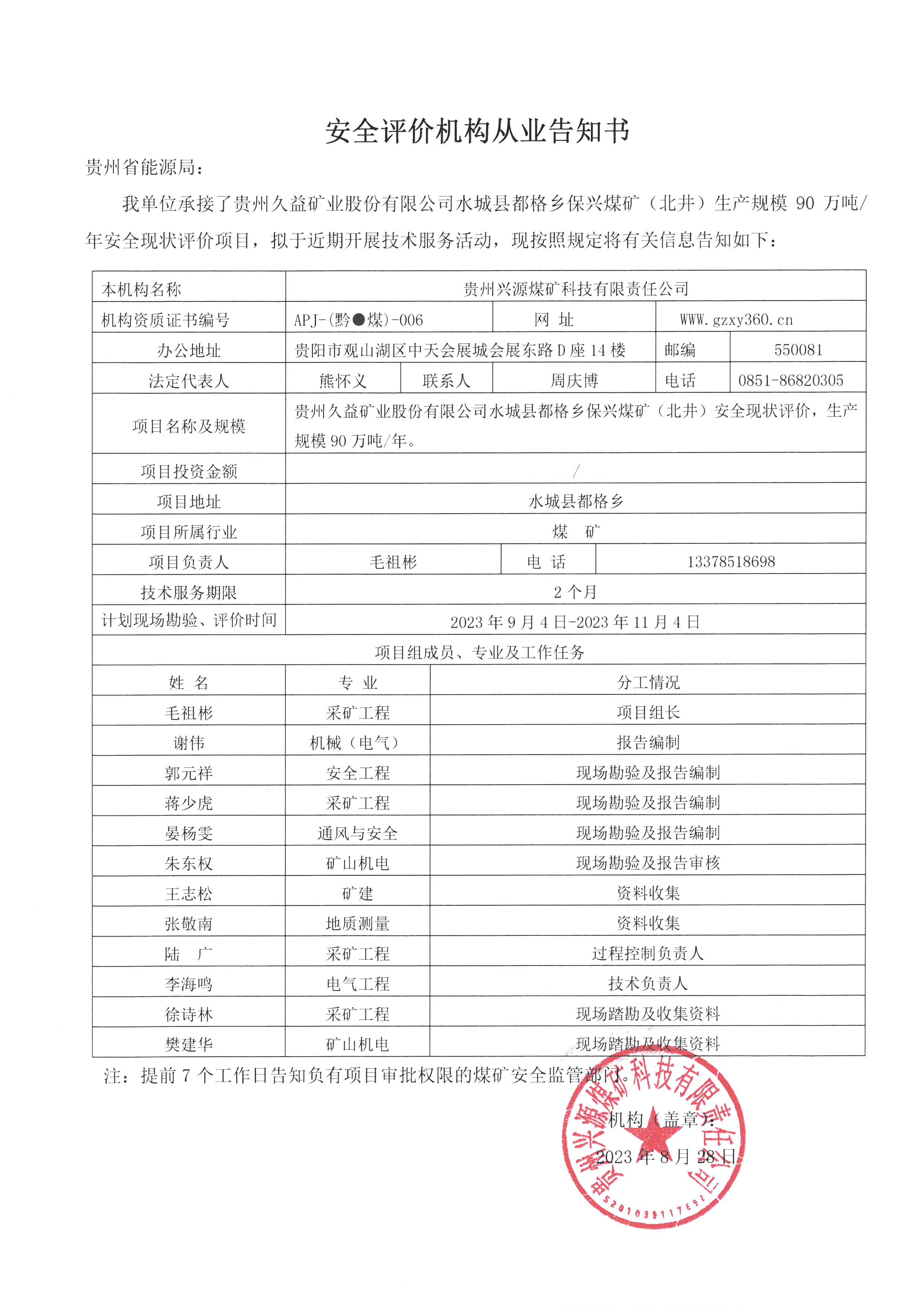 安全評(píng)價(jià)機(jī)構(gòu)從業(yè)告知書【貴州久益礦業(yè)股份有限公司水城縣都格鄉(xiāng)保興煤礦(北井)】